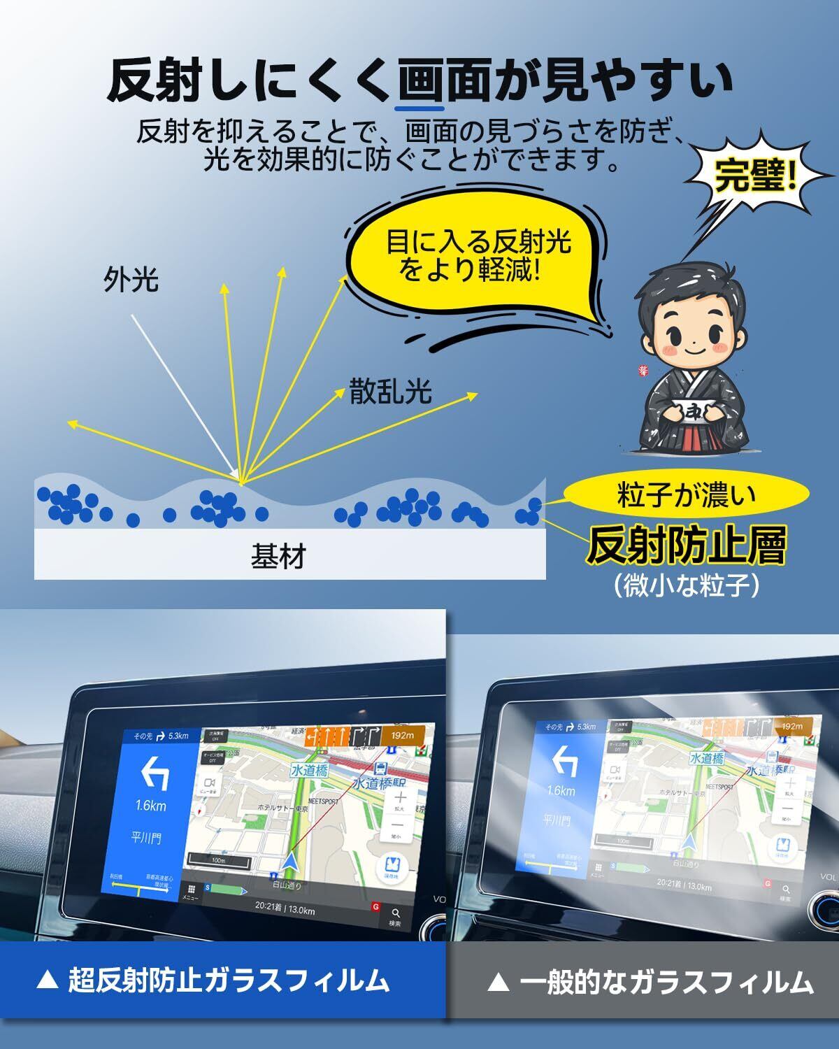 【新たに開発した「スーパー反射防止フィルム」】太陽光や周囲の明かりなどの反射によって、ナビガーション画面が見にくくなったことはありませんか。「反射防止AGLRフィルム」は特殊なAG(ハードコート)加工により、入射光を拡散することで照明や周囲からの映り込みを抑えて、画面の視認性を向上させる機能があります。また、優れた反射対抗性に加え、指紋や水などを付きにくくなり、拭き取りやすい機能を併せ持っています。AG層と、防汚機能を有したAF層の2層コーティングを積層化することで実現しています。シエンタ 10系 カーナビを傷から守る同時に、運転中の視認性を向上させます。
