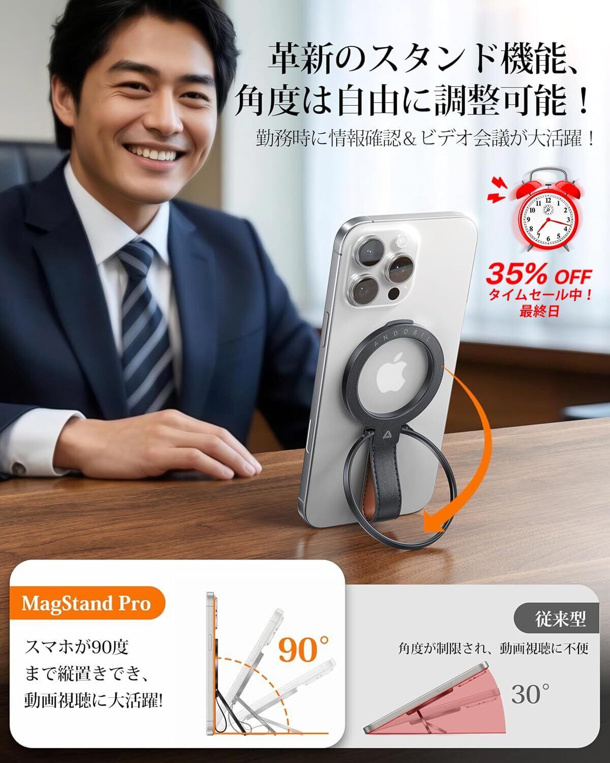 【より快適な視野角・より快適な暮らし】市販の小型スマホリングでは縦置きができなかったり、縦置きの角度が足りなかったりする問題を解決するため、Andobilのプロダクトマネージャーが5年間かけて高級牛革製MagStand Proの開発に成功しました。このMagSafe リングは、縦置きの角度が0°から90°まで、横置きの角度が0°から180°まで多角度調整することができす。MagStandは、仕事にもプライベートにも欠かせない理想的なパートナーです。仕事中は、スマホリングをしっかりと支え、快適な視角でメールや各種資料を確認したり、スムーズにビデオ会議を行ったり、業務の最新状況をすばやく把握したりすることができ、作業効率が向上します。一方で、休憩時間には、TikTokを見たり、YouTubeの動画を楽しんだり、NHKやYahooニュースをチェックしたりと、MagStandが安定した支えと自由な角度調整を提供し、リラックスしながら効率的で心地よい一日をお過ごしいただけます。