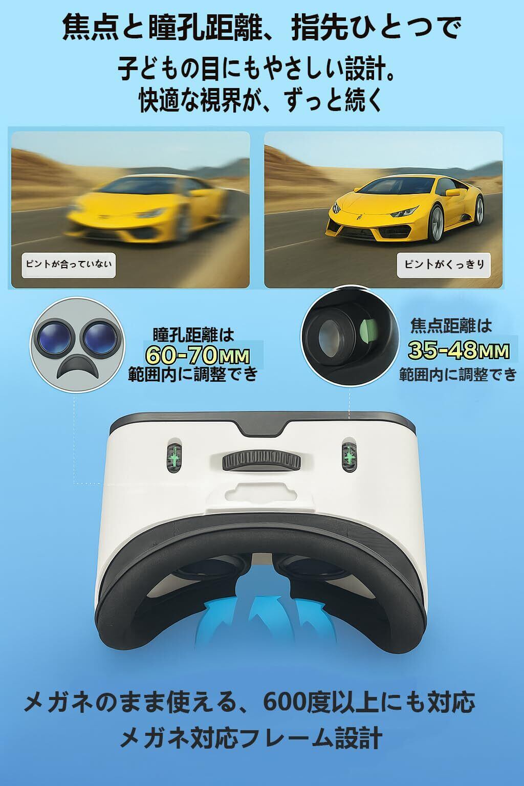 没入感あふれる映像体験(眼鏡対応):非球面PMMAレンズを採用し、1080Pの高解像度&360°パノラマ映像で没入感抜群。焦点・瞳孔距離は個別調整可能で、いつでも鮮明な視界をキープ。眼鏡をかけたままでも使用可能、600度以上の近視にも対応。