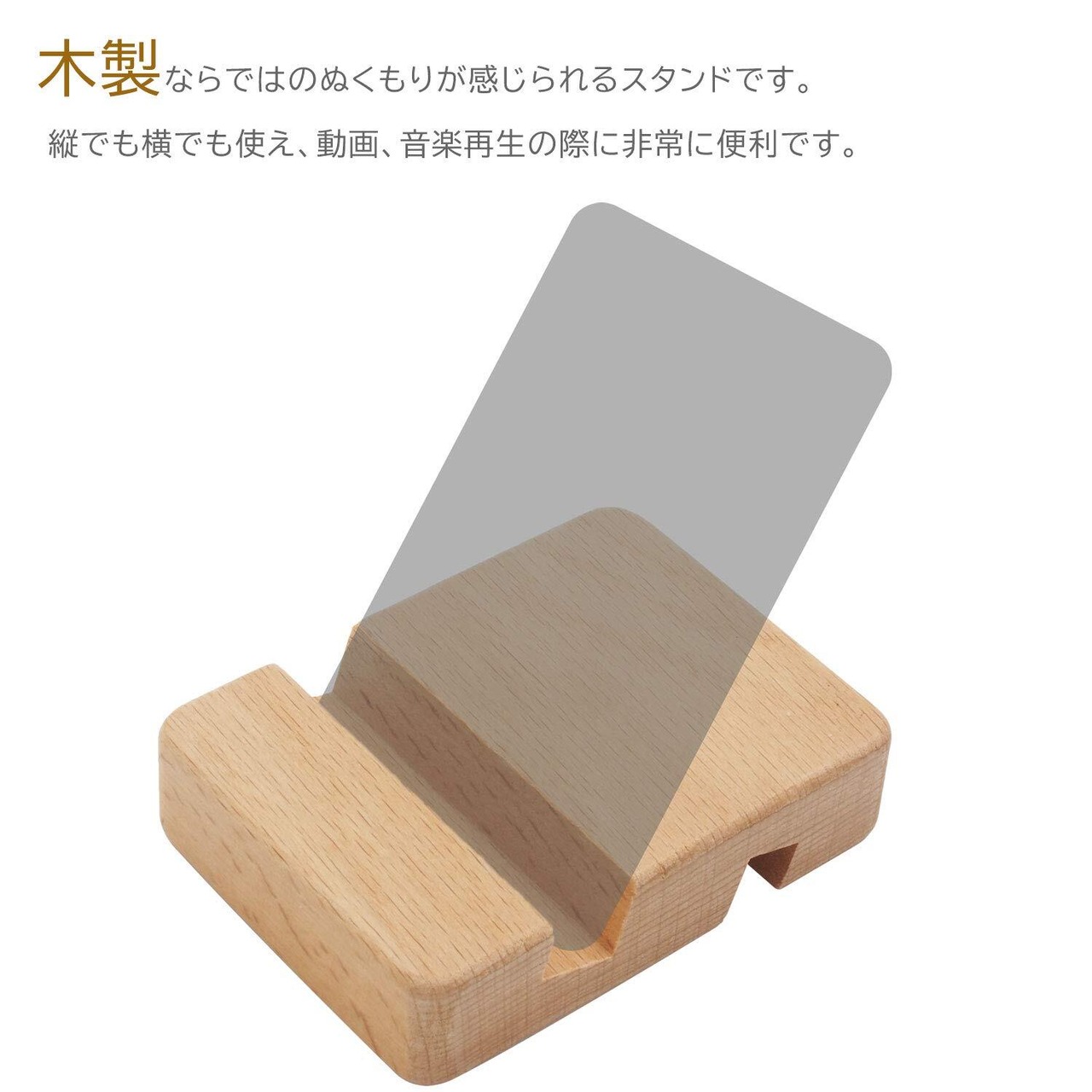 木製ならではのぬくもりが感じられるスタンドです。縦でも横でも使え、動画、音楽再生の際に非常に便利です