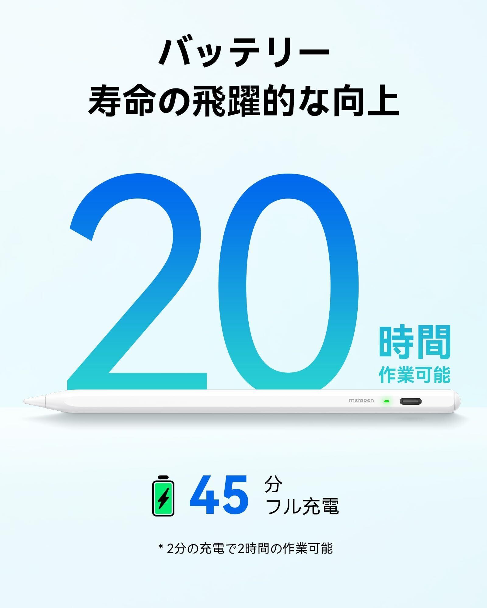 【20時間のバッテリー作業・2倍の充電スピード】iPad用タッチペンMetapen Air8は、2分の充電で最大2時間、45分の充電で最大20時間使用できます。Air 8 は、市場で最も長いバッテリー寿命と最速の充電速度を実現します。3色のLEDインジケーターがペンの電源状態を知らせてくれるので、iPadペンシルAir8の急速充電とバッテリー寿命を楽しむことができ、電源切れの心配はもうありません! (ご注意: USB-C ケーブルで充電して、ワイヤレス充電や磁気吸引で充電できません。)