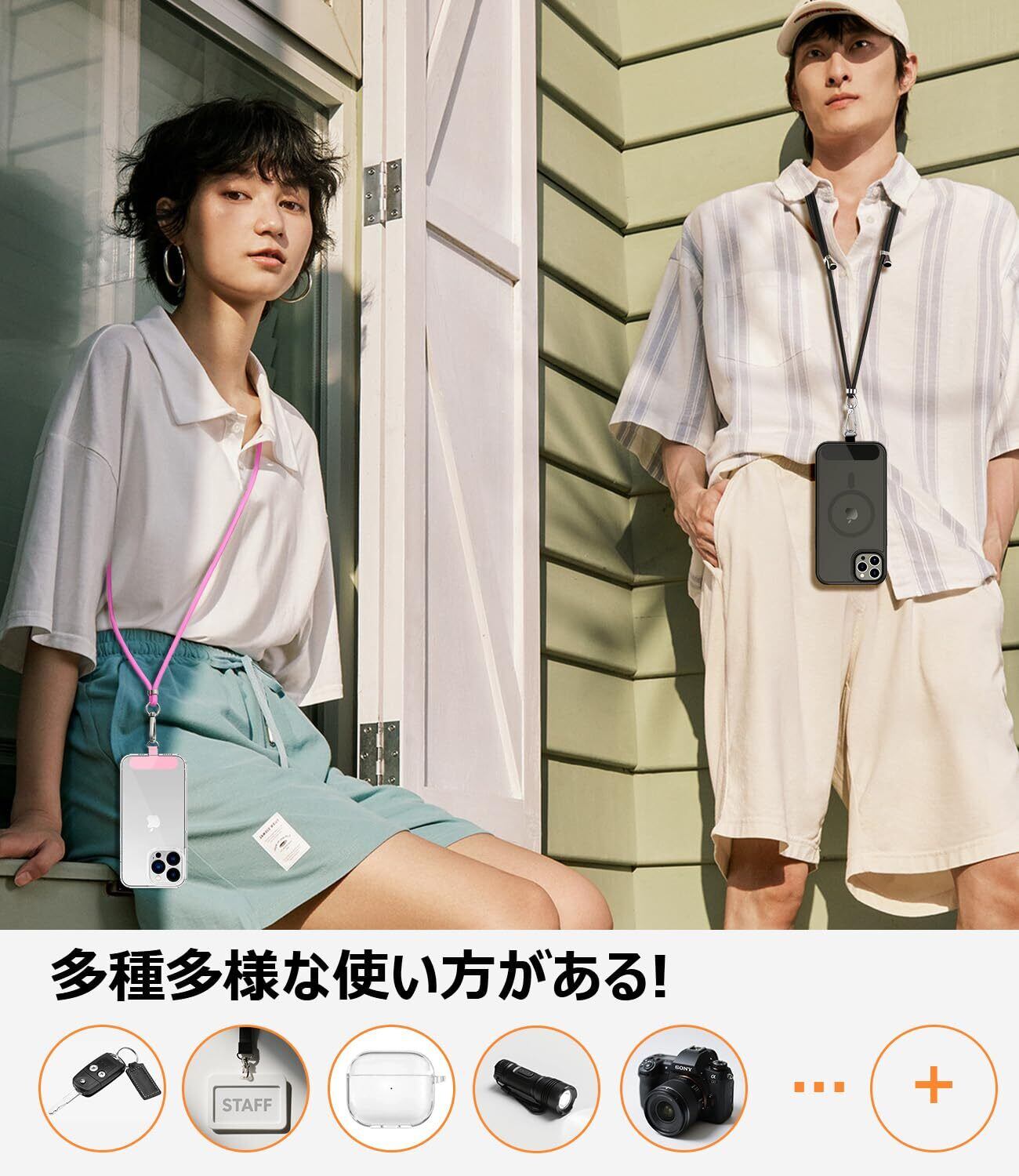 【肩・首への負担を軽減する優しい設計】両端はすっきりまとまるストラップで動きやすさアップ。二重構造のネックストラップが首にかかる圧力を分散。動きに合わせて自然にフィットするので、肩凝りや首の痛みに悩む方にも優しい設計です。育児中のママ・パパも、スマホを肩に掛けるだけで手が空き、SNSのチェックや写真撮影もすぐにできるから、忙しい毎日のサポート役にぴったりです。