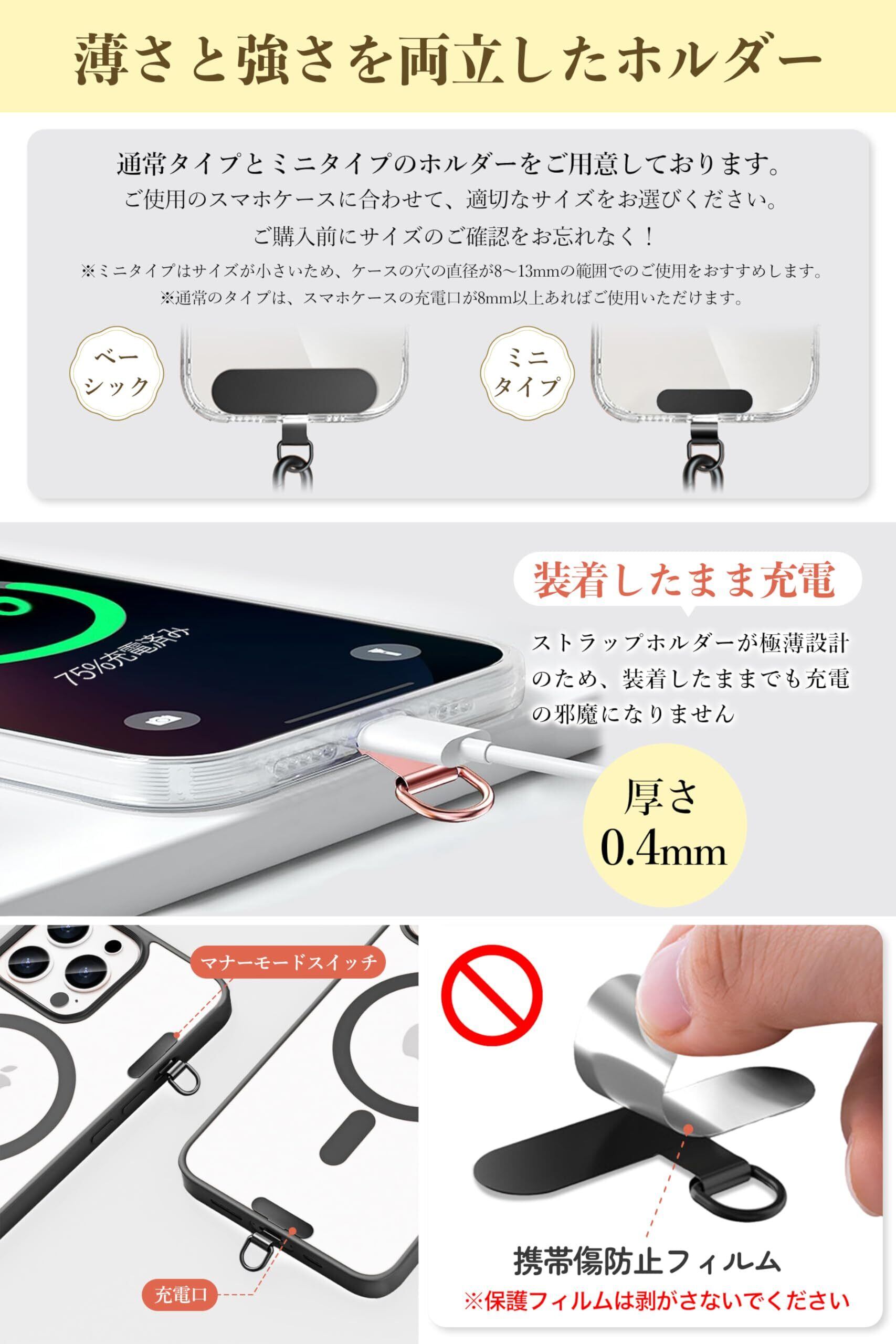 【ミニタイプ新登場!・10色展開】通常のストラップホルダーに加え、よりコンパクトで精巧な「ミニタイプ」もご用意しました。充電口はもちろん、マナーモードスイッチなどにもお使いいただけます。※ミニタイプはサイズが小さいため、ケースの穴の直径が8〜13mmの範囲でのご使用をおすすめします。それ以外の場合、抜けやすくなる可能性がございますのでご注意ください。※通常のタイプは、スマホケースの充電口が8mm以上あればご使用いただけます。また、全10色のカラーバリエーションから自由にお選びいただけるので、スタイルや気分に合わせたコーディネートをお楽しみいただけます
