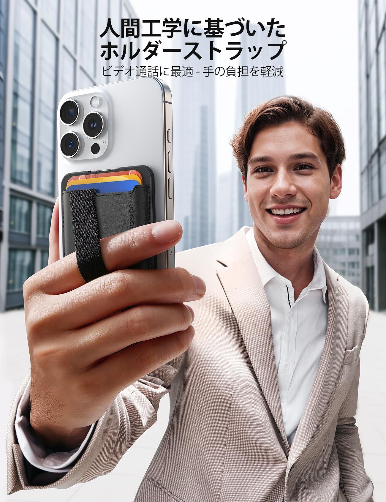 JOYROOM MagSafe カードケース スマホスタンド ホルダー ハンドストラップ 付き ヴィーガンレザー 3枚カード収納可 多機能スタンド MagSafe対応ウォレット 財布 調節可能なスタンド 強力磁気ウォレット マグネットカードホルダー マグネットポケット iPhone 16/15/14/13/12シリーズに対応 ブラック