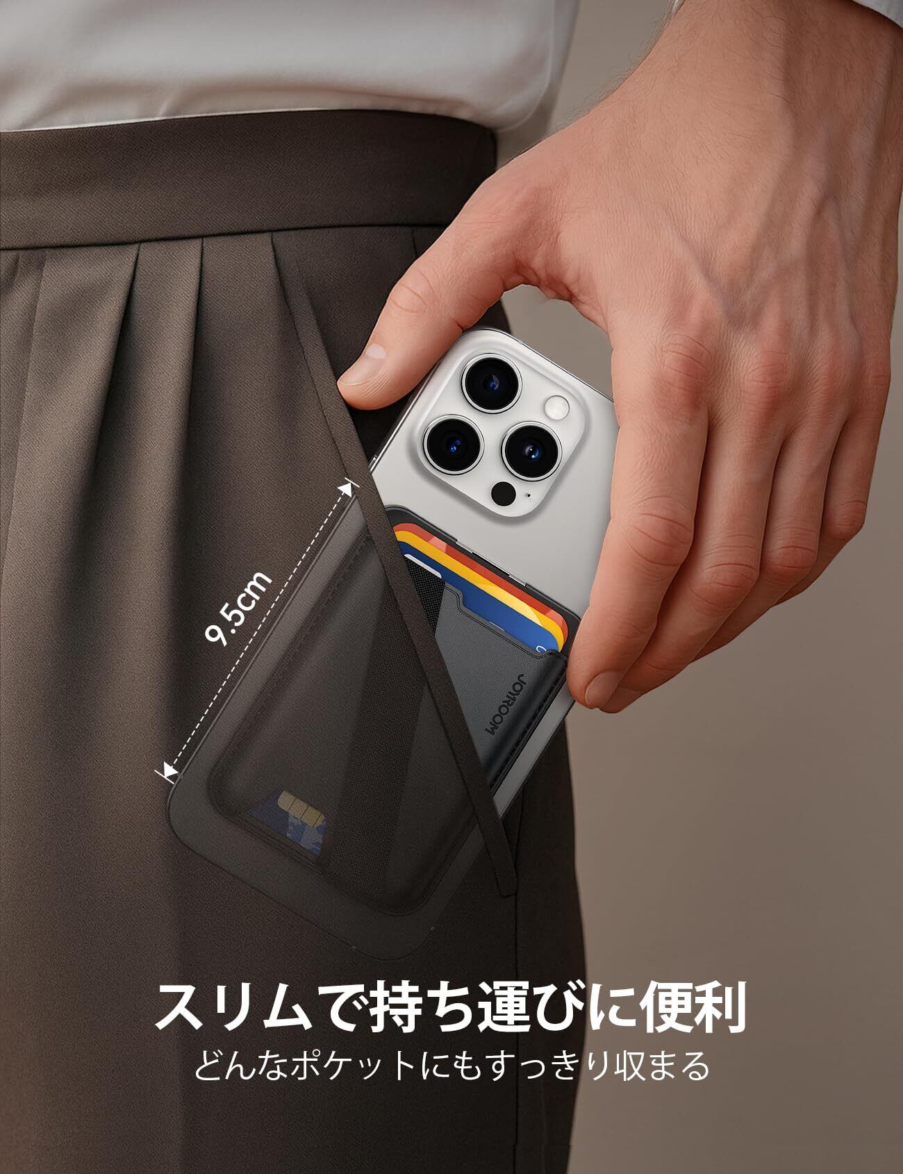 【超強力MagSafe磁気吸着!落下しらず】MagSafeカードケースが強力な磁力でスマホにしっかり固定、携帯性抜群。2倍強化磁力:高密度ネオジム磁石アレイ採用で、通常カードホルダーより50%アップの吸着力。通勤安心設計、満員電車でもスマホがピタッと固定、人混みでの落下を徹底防止。運動時も安定、ランニングやサイクリングの激しい振動でも、スマホが微動だにせず運動に集中可能です。