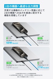 2つのケーブルを1つに:2本のUSB-C ケーブルを1つにまとめました。お使いのUSB-C ポート搭載機器へ2台同時に充電することが可能。旅行や出張など、持ち運びにも最適です。