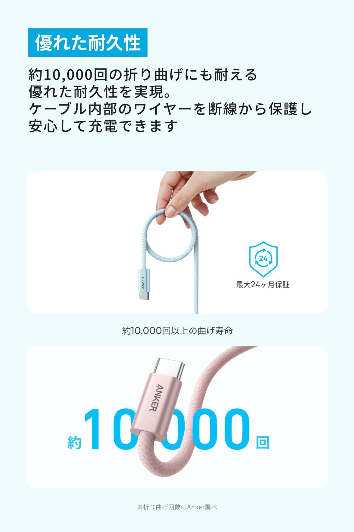 優れた耐久性:約10,000回の折り曲げにも耐える優れた耐久性を実現。ケーブル内部のワイヤーを断線から保護し安心して充電できます。