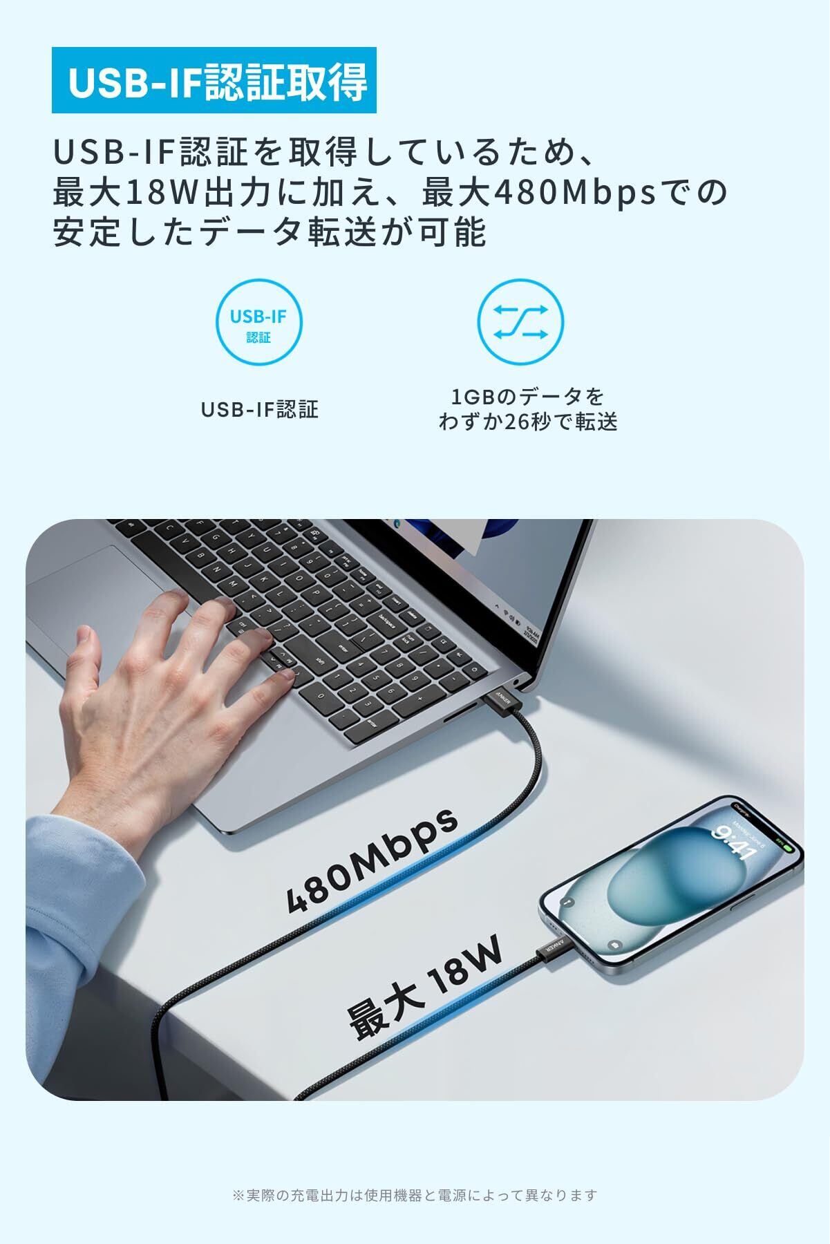 USB-IF認証:USB-IF認証を取得しているため、 最大18W出力に加え、最大480Mbpsでの 安定したデータ転送が可能