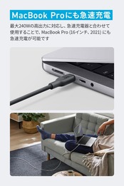 急速充電:最大出力240Wの高出力に対応し、ノートPCやタブレット端末、スマートフォン等の幅広い機器に急速充電が可能です。(※充電器は別売りです。本製品はデータ転送及び充電にのみ対応し、映像出力には対応しておりません。)