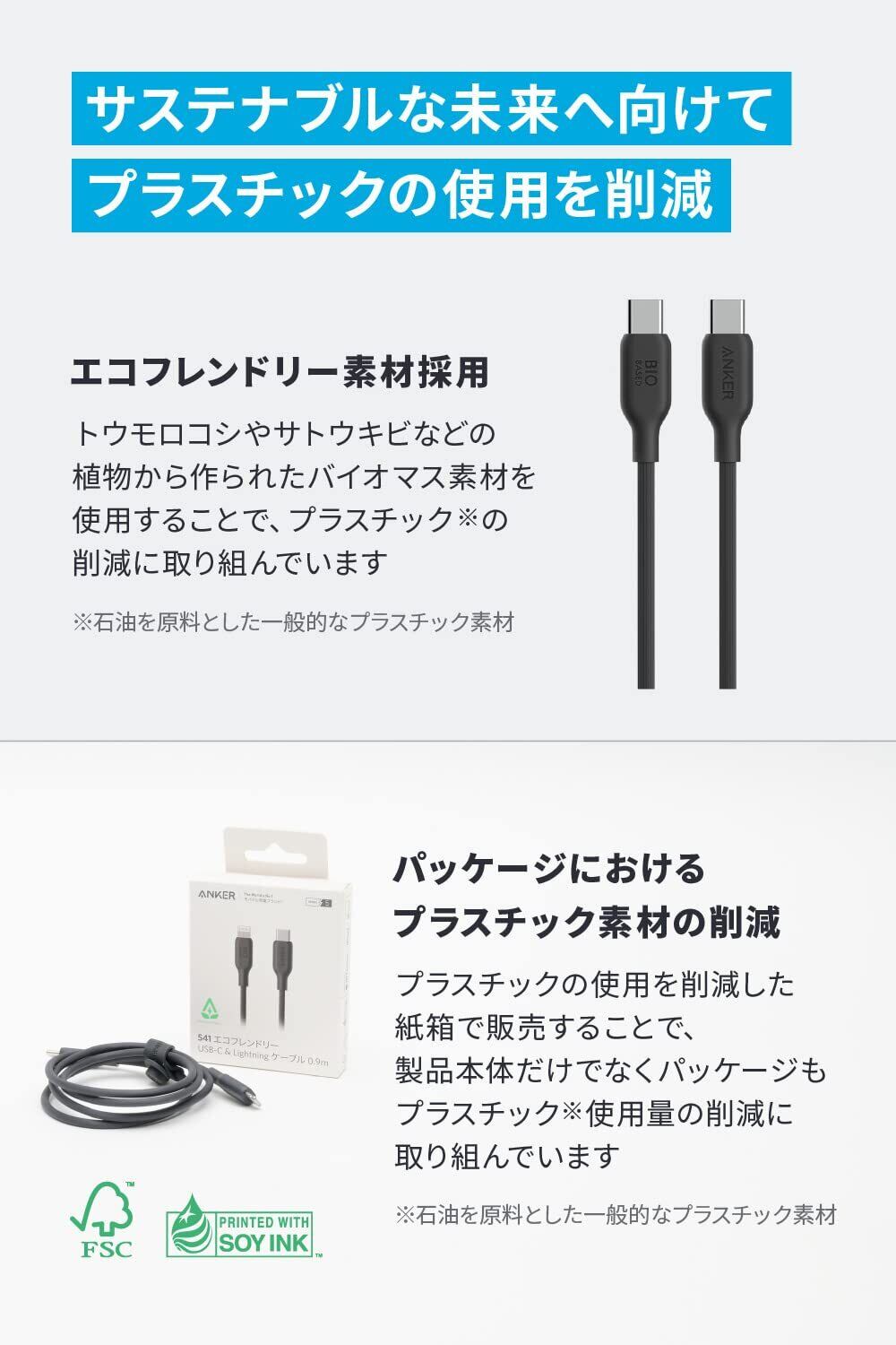Anker初のエコフレンドリー素材採用:Ankerの従来のケーブル製品の外装はプラスチック素材を100%使用していたところ、本製品は60%に削減し、40%はトウモロコシやサトウキビなどの植物由来のエコフレンドリー素材に置き換えました。さらに製品本体だけでなくパッケージにも配慮し、本製品に合わせて主に紙を使用することで、プラスチック使用量の削減に取り組んでいます。