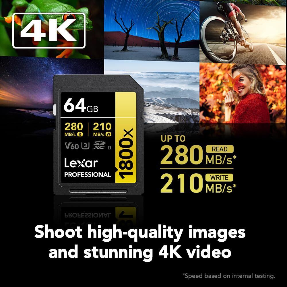 Lexar SDカード Professional 1800x SDXCカード 最大読込280MB/秒 書込210MB/秒 UHS-II Class 10 U3 V60 4K Ultra HD 動画撮影 国内正規品 (64GB) LSD1800064G-BNNNG