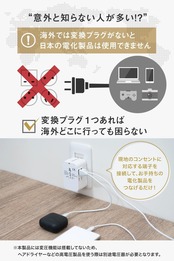 【3つのデバイス同時充電】:通常のコンセント+USBポートを2つ搭載しているので3台までのデバイスを同時充電可能。 【安全性を追求したデザイン】:欧州規格、ISOを各種安全性を証明する公式規格を生産工場にて取得している製品になります。また、壊れにくい素材を使用、専用の防衝撃・防水ケースも付属。 ※当製品は変圧器ではなく変換プラグのため、ヘアドライヤー、ヘアアイロン、電子レンジなどの高電圧電化製品をご利用いただくと内部ショートが発生し、火災の原因にもなり危険なため、ご利用はいただけません。スマートフォン、タブレット、デジタルカメラ機器、PCの充電を想定した製品になります。