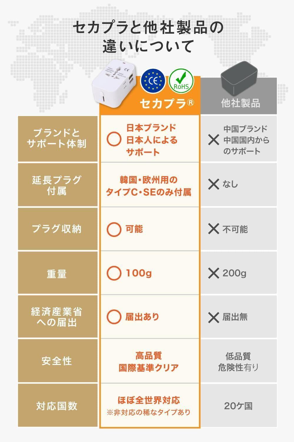【世界190カ国で使えるスマート変換プラグ "セカプラ"ベーシックモデル】: ※こちらの製品は「海外での使用のみを目的とした製品のため日本での使用不可」になります。日本人外国旅行者及び外国人観光客が海外での使用を対象とした製品になります。 「韓国や一部ヨーロッパにてプラグの長さが足りなく届かなかった・・」と言うお声に応じ、韓国や一部欧州国のタイプC のみ対応した延長プラグも付属しています。特に、韓国は一般的な類似商品ですとプラグが届かなく充電ができないことが多い報告を受けておりますので推奨しております。
