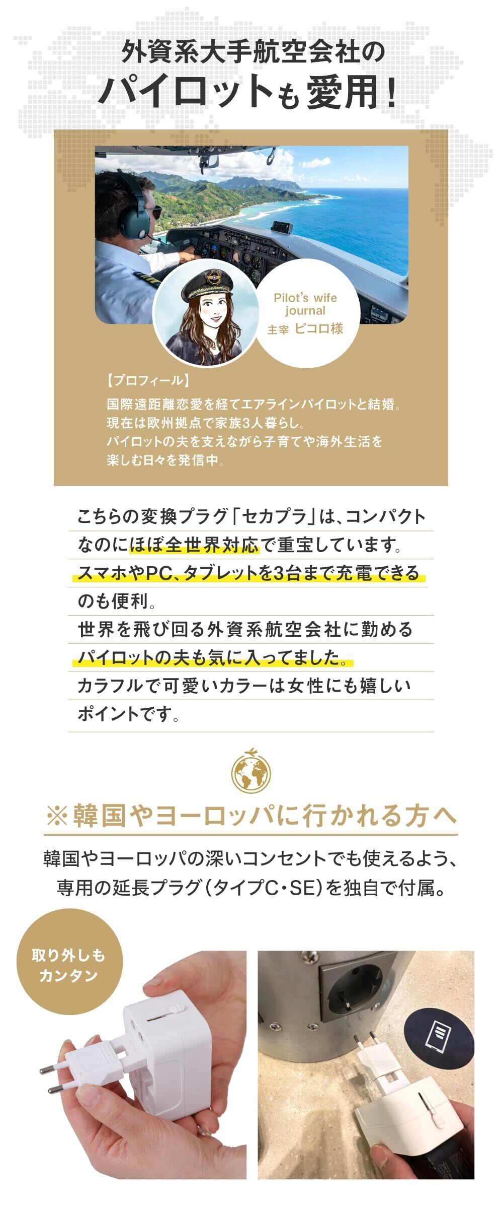 ■【海外旅行の必需品!】セカプラの「ダブルUSBポート搭載変換プラグ」は、全世界のコンセントに対応し、韓国をはじめとする海外旅行や出張に最適なアイテムです。現役パイロットも推薦するこの製品は、旅行中の電源不足の悩みを簡単に解決します!