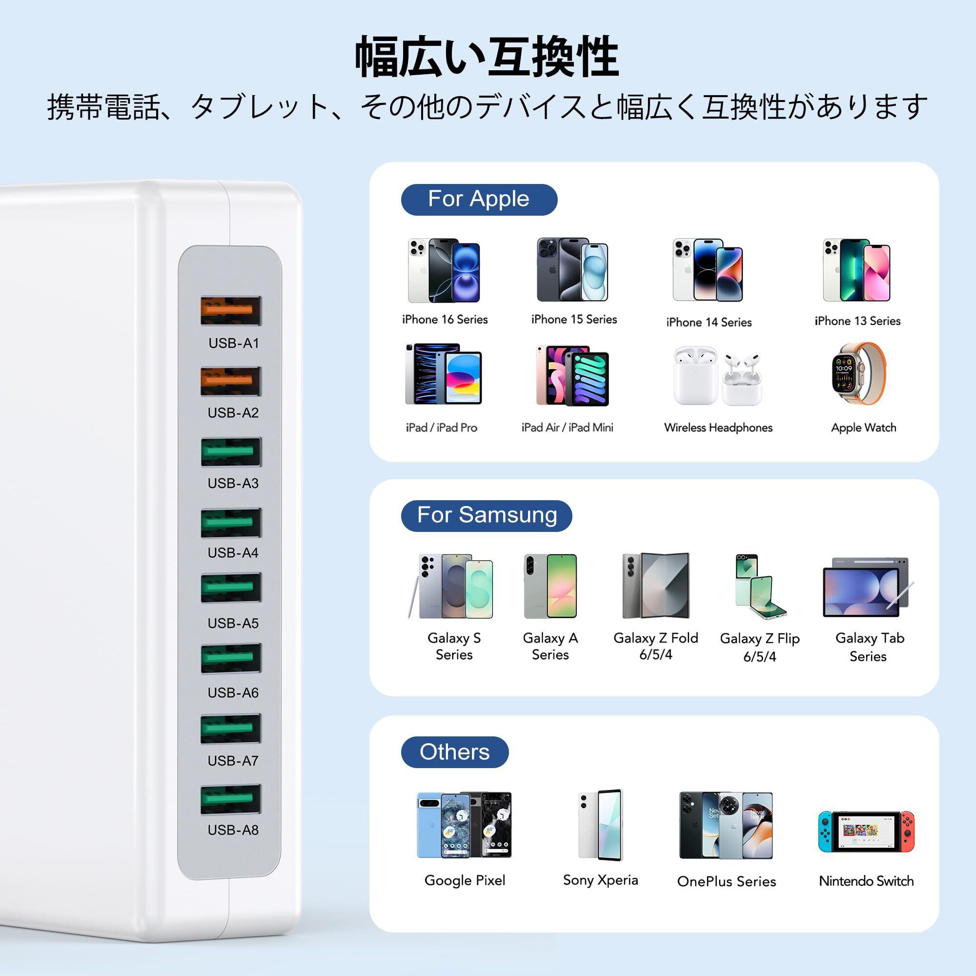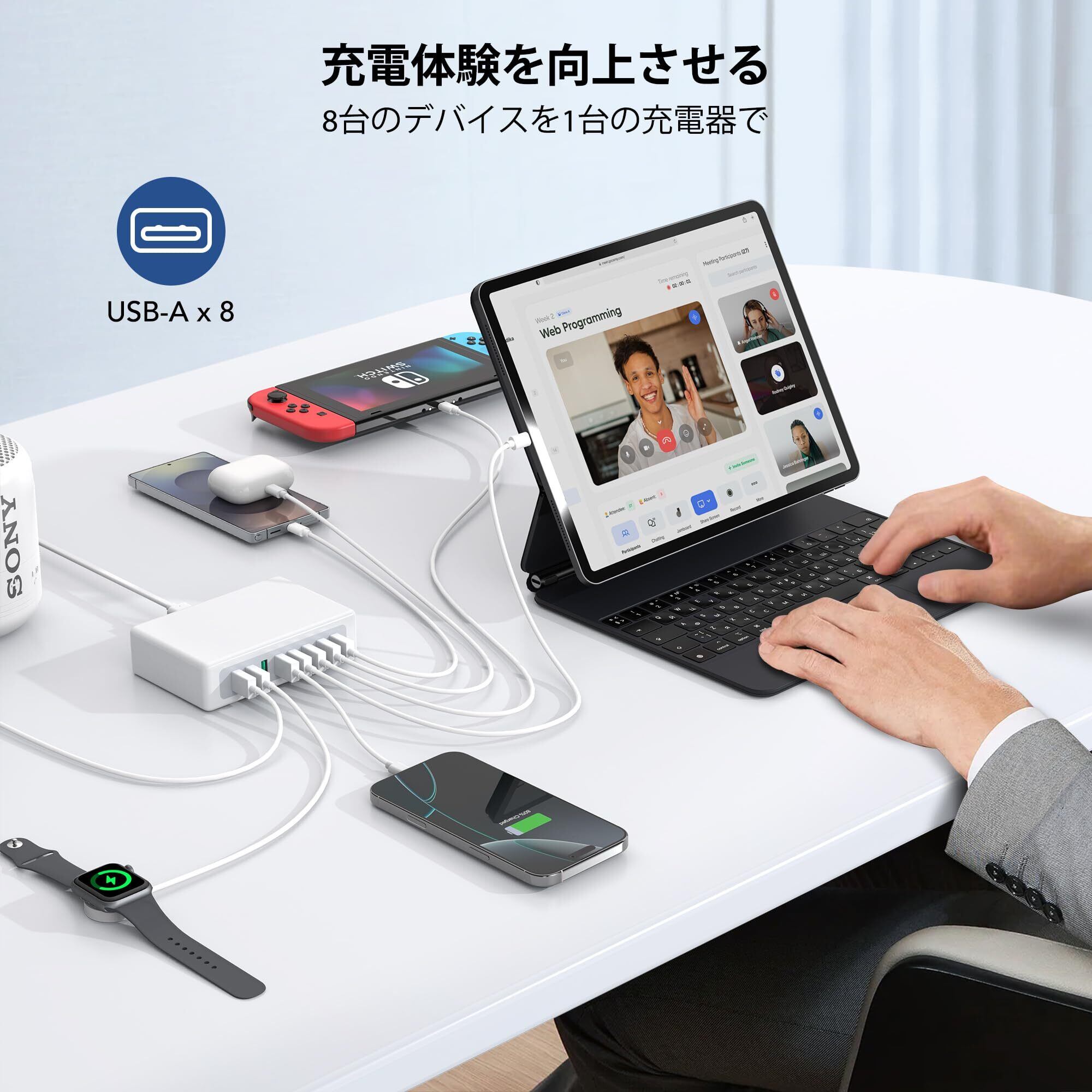 ■【旅行に最適な8台同時充電!】このUSBコンセントは、合計100Wの出力により、最大8台のデバイスを同時に充電することができます。出張や旅行時に、スマートフォン、タブレットなどのデバイスを同時に充電できるので、煩わしさから解放されます。