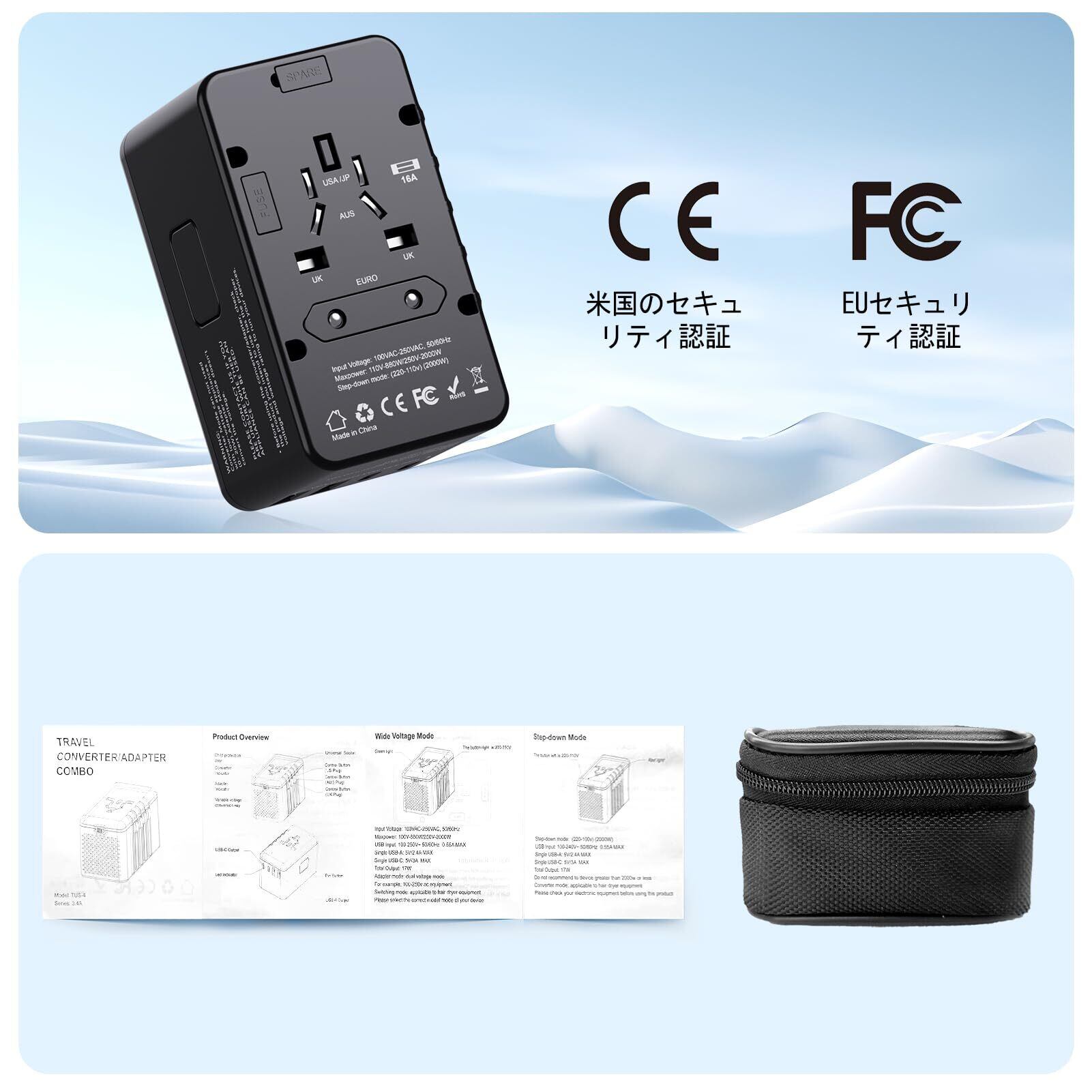 【在庫限り】X-STAR アップグレード 5in1超小型変圧器+変換プラグ付き 全世界対応 海外旅行用 純正弦波 220Vから100V-110V 日本製100V電気製品対応 韓国/中国/ヨーロッパ/オーストラリア等200ヶ国対応 2USB 2Type-Cポート、3.4A 5台同時可能 コンセントロック機能 海外用電源変換アダプターセット 一体型