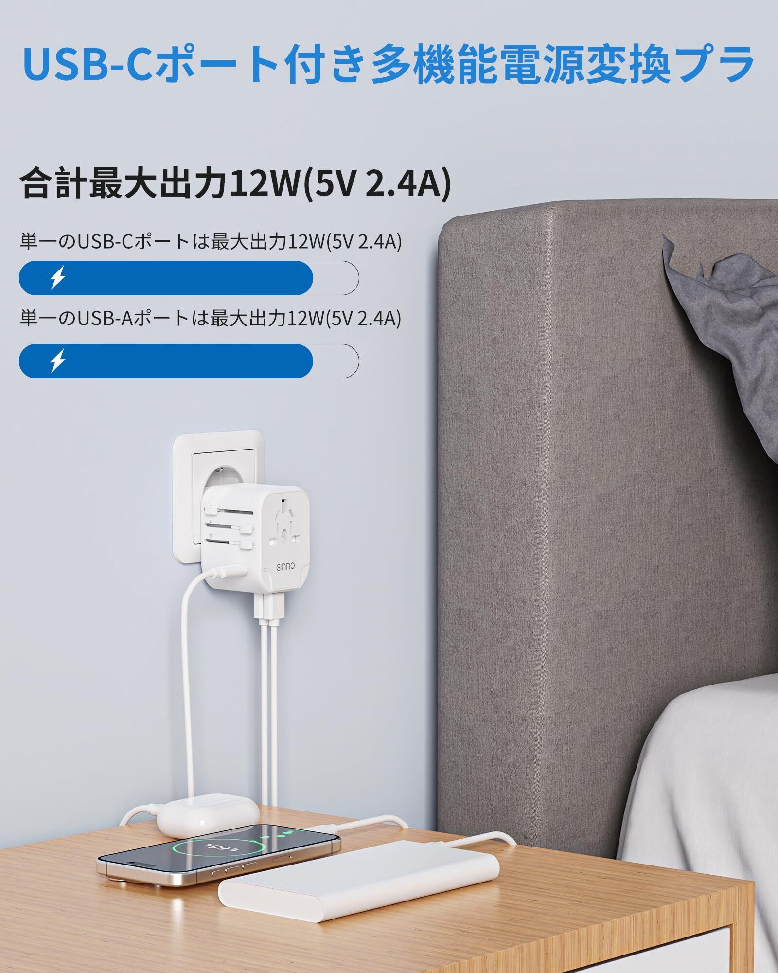 【USBポート付き 旅行充電器】この海外用acアダプター変換プラグは2つのtype-aポート及び1つのtype-cポートを搭載。単一USB-Aポートの最大出力は5V 2.4A、USB-Cポートの最大出力は5V 2.4Aので、3個USBポートは合計5V 2.4Aになります。このマルチ変換プラグはスマホ、イヤホン、ラップトップ、タブレットやデジタルカメラなど、旅行中のほとんどの電子製品と互換性があります。