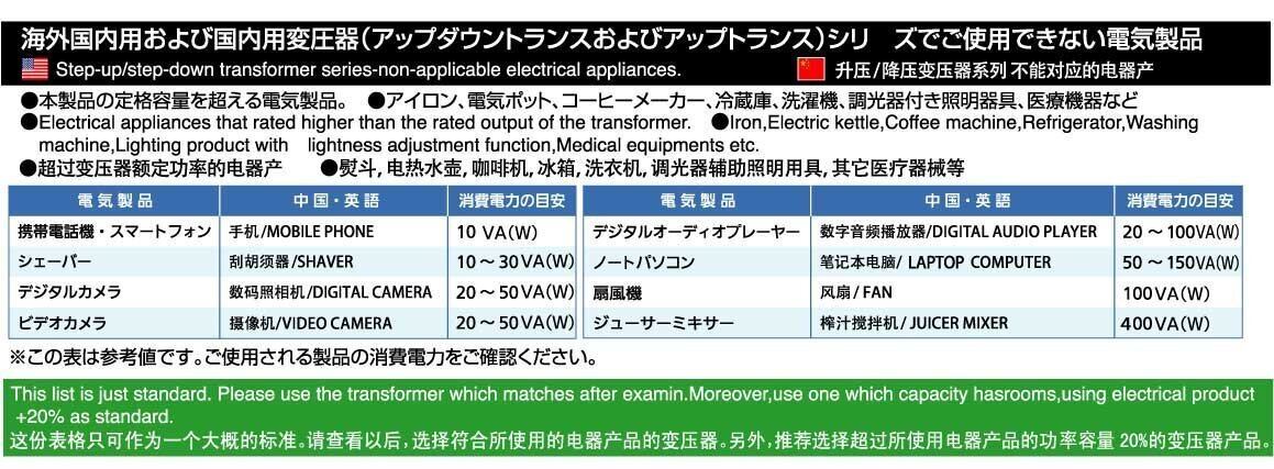 ・モーターや熱を発する電気製品は初期電流が定格電流の2-3倍流れますので、2-3倍余裕のある変圧器をご使用ください。