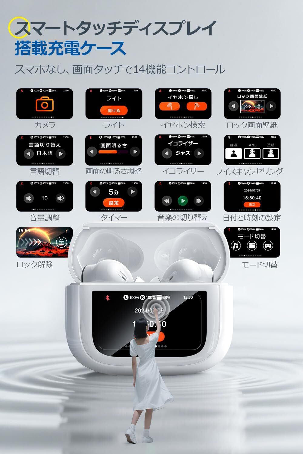 【スマートタッチケース、14機能簡単操作でイヤホン探しも安心】 従来のワイヤレスイヤホンケースとは違い、スマートタッチディスプレイ搭載充電ケースを採用。スマホなしで14機能(音楽切替/ノイズキャンセリング/外音取込/音量調整/イヤホン探し/イコライザー設定/ロック画面壁紙/ライト点灯/タイマー/画面明るさ調整/言語切替/日時設定/ロック解除/バッテリー残量表示)をサッと操作可能。 イヤホン探し機能で万が一紛失しても安心。通勤電車内やスポーツ中でもケースだけで直感操作でき、小型/軽量なデザインで携帯性も抜群。毎日の使い心地が格段に向上します。