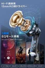 【15mmドライバー+5種EQモード搭載、音楽ジャンルを問わず高音質を実現】 一般的なイヤホンを凌駕する15mm大口径ドライバーを搭載。深みのある低音と透明感のある中高音で、まるでライブ会場にいるかのような迫力の音場を実現。 さらにノーマル/ロック/ポップス/クラシック/ジャズの5種EQモードを搭載し、聴く音楽や気分に合わせたサウンド調整が自在に行えます。音楽鑑賞はもちろん、動画視聴やゲーム、移動中のリフレッシュにも活躍するワイヤレスイヤホンです。