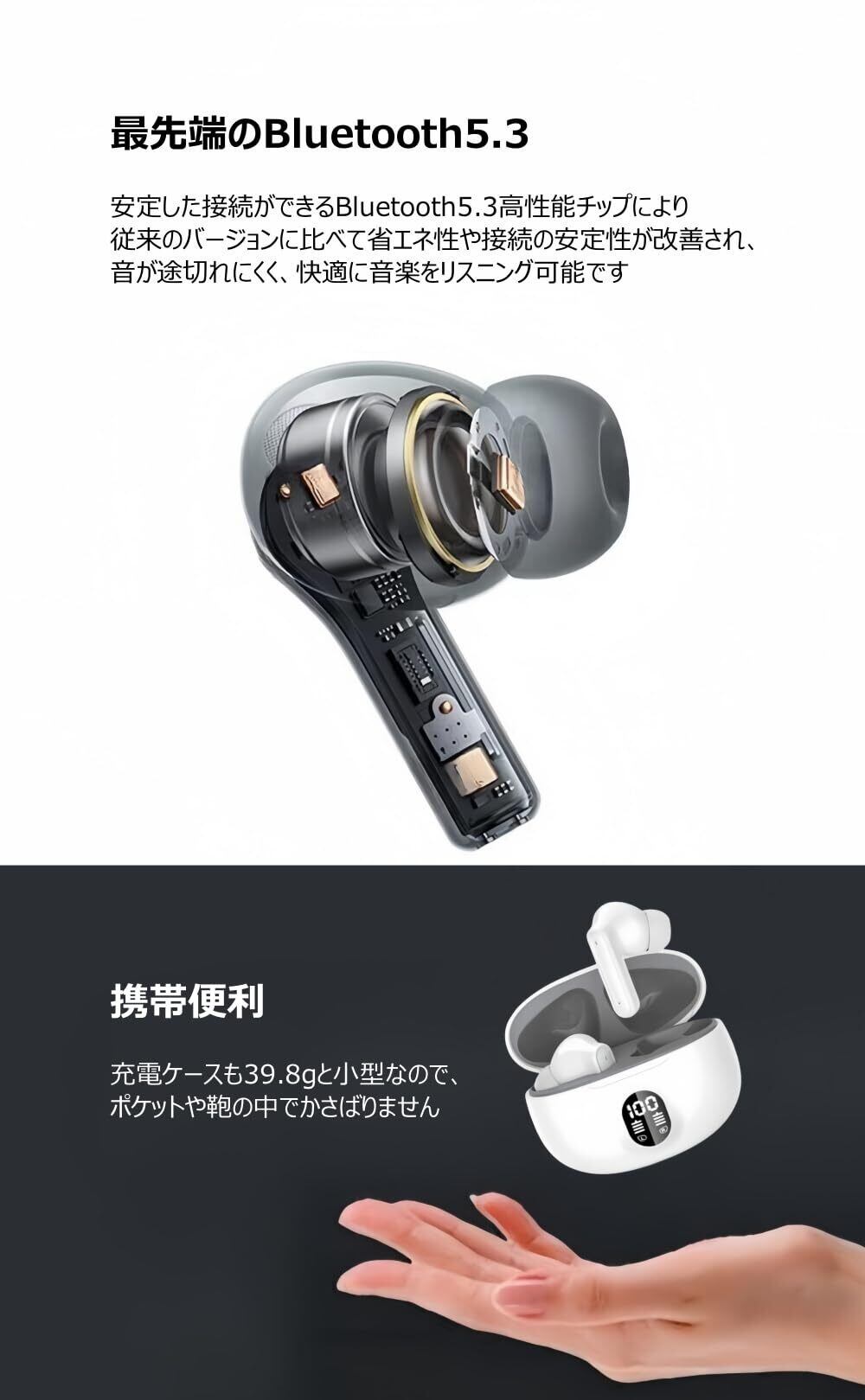 【Bluetooth5.3&瞬時接続技術】Bluetooth5.3チップを搭載しており、高速通信、ノイズ 低減を実現し、省エネ化及び音切れ・音ズレの防止力を大幅に改善されました。瞬時接続技術を採用しており、2回目以降の接続は自動的にデバイスとの瞬時接続が実現されます。複雑な操作は必要ありませんので、初心者の方でも簡単に操作できるbluetoothイヤホンワイヤレスイヤホンとなっています。