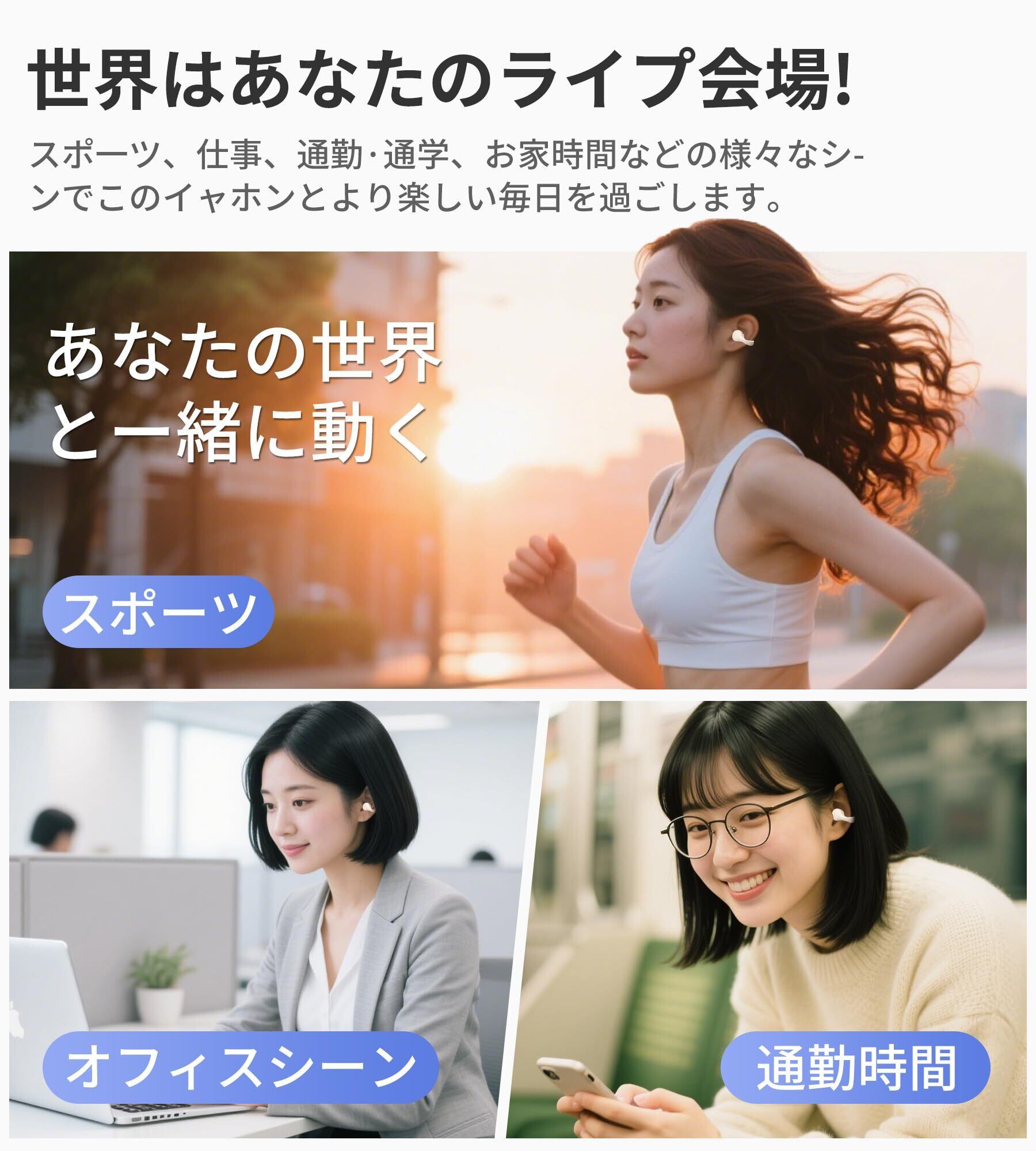 【優れた装着感、わずか4.7g】長時間のリスニングでも快適に使用できるよう設計された空気伝導イヤホンです。耳にやさしくフィットし、カナル型イヤホン特有の閉塞感や痛み、そして骨伝導イヤホンの圧迫感を避けることができます。片耳でわずか4.7gという超軽量設計により、着けていることを忘れるほどの自然な装着感を実現。ランニングやトレーニングなどの運動中でも安定した装着感を保ち、一般的なブルートゥースイヤホンよりも幅広いシーンで活躍します。