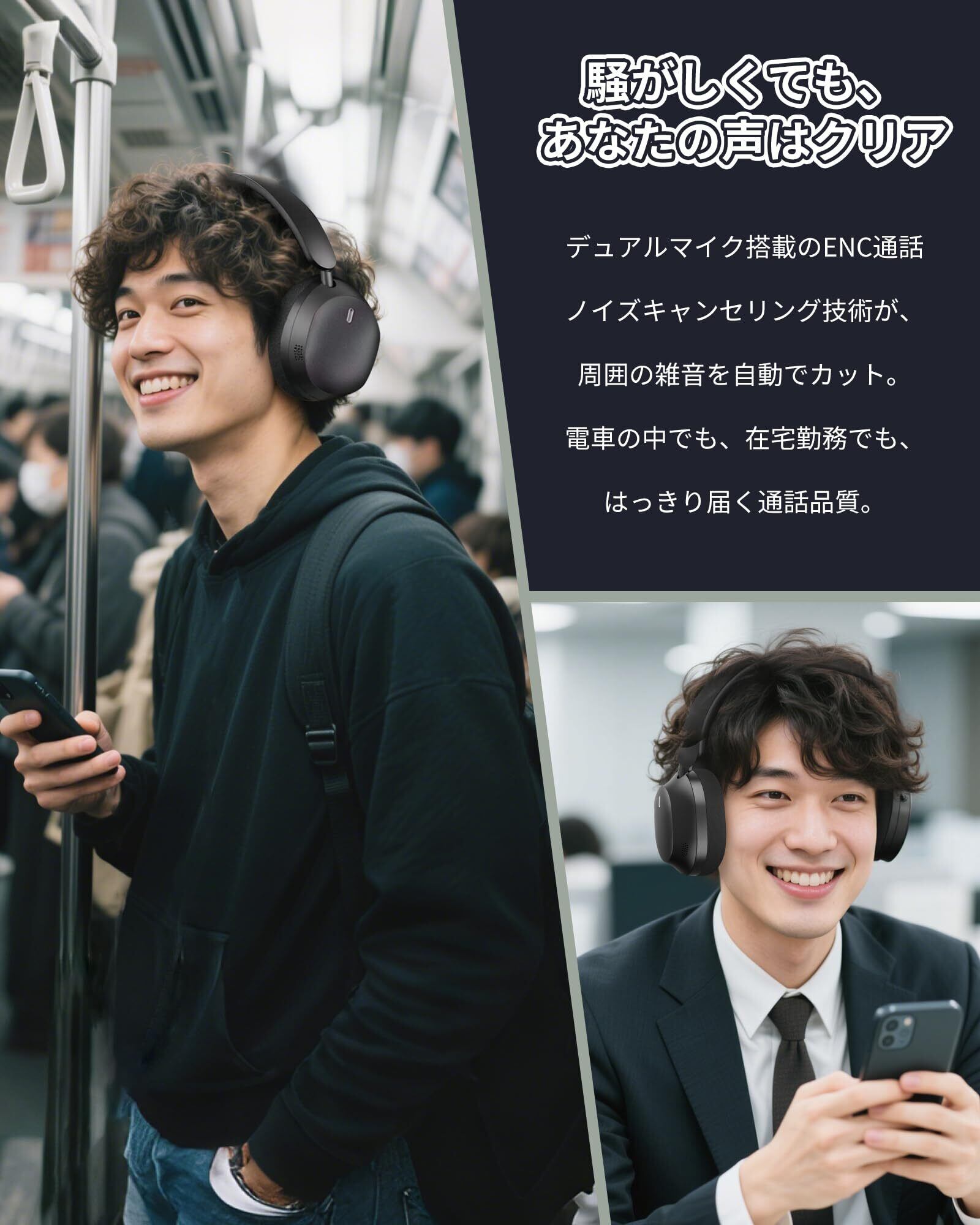 マイク付き × 高品質通話 内蔵マイク搭載のマイク付きヘッドホンは、AI ノイズキャンセリング技術により風切り音や背景音を低減し、クリアな通話体験を提供。ビデオ会議や SNS 通話時にも相手の声を鮮明に伝え、作業効率を上げます。