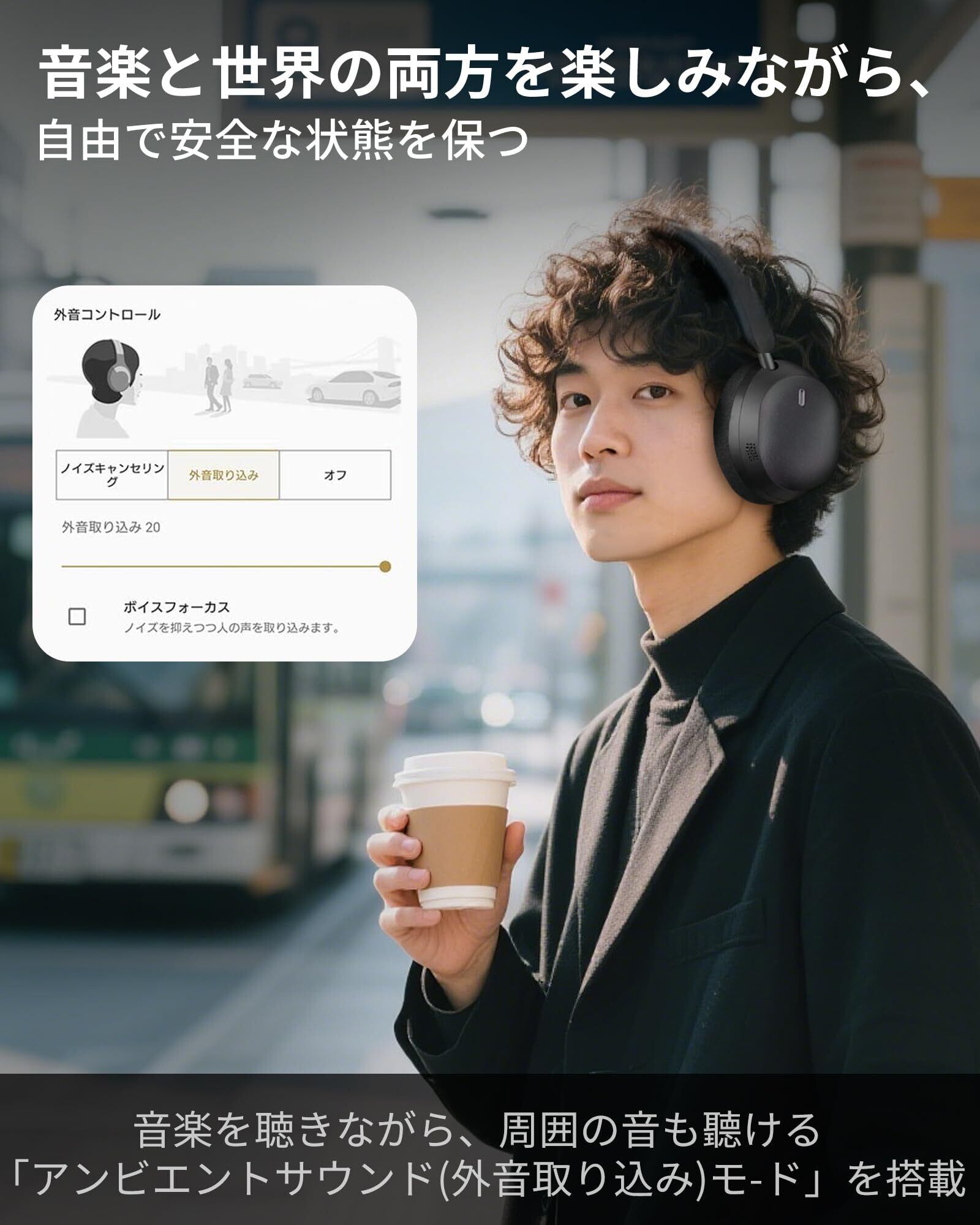 ハイブリッドノイズキャンセリング × 外音取り込みモード 最新 ANC 技術搭載のヘッドホンは、周囲の交通音や騒音を効果的にカットし、集中した作業や音楽鑑賞を実現。一方、ワイヤレスモード時に外音取り込みモードを簡単切替することで、歩行中や会話時にも周囲の状況を確認しながら安全に使用可能。通勤・旅行・自宅での快適な時間をサポートします。