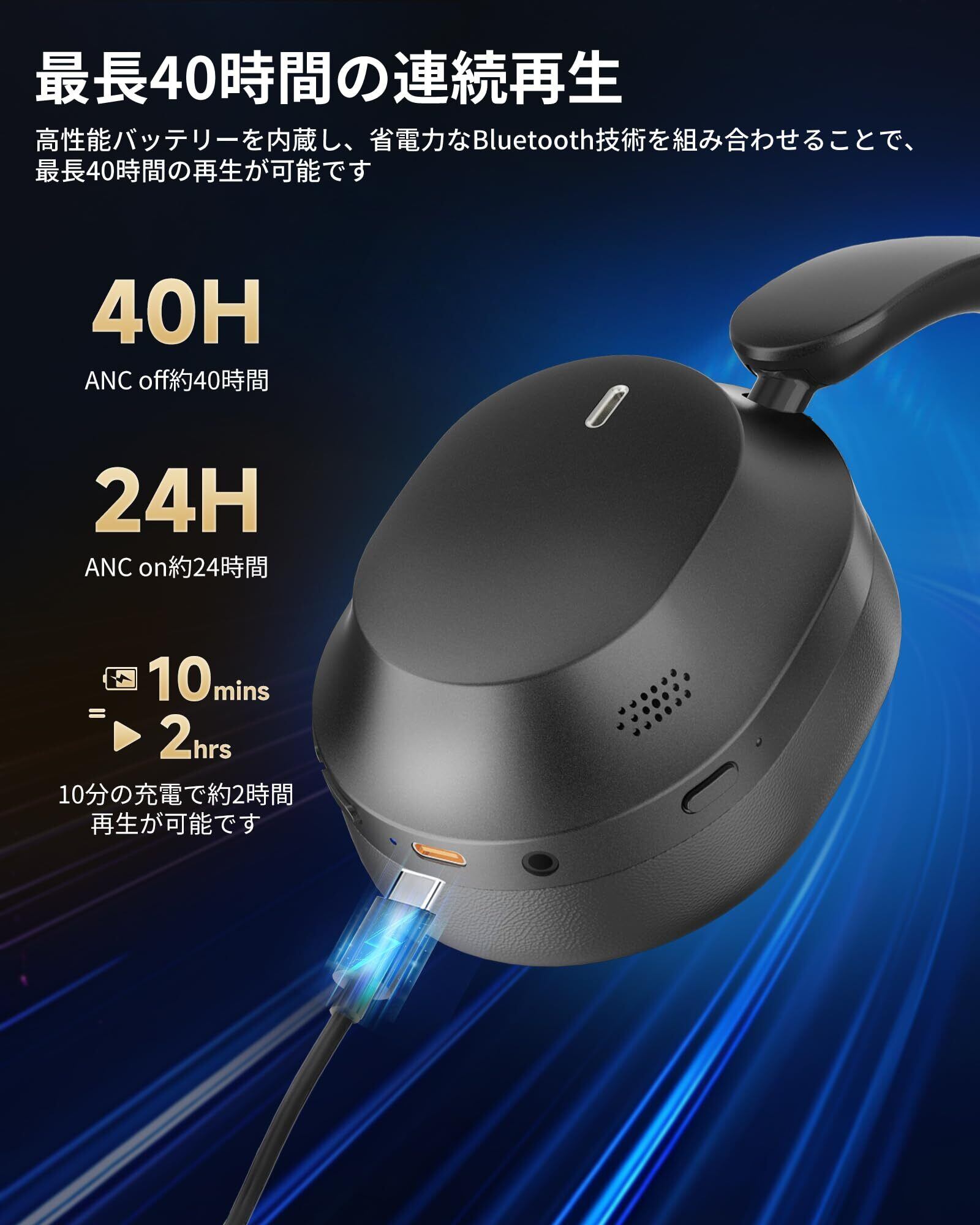 軽量折りたたみ設計 × 長時間装着快適 ワイヤレスモードで最大 40 時間の連続再生(ANC OFF 時)、充電 10 分で約 2 時間の再生が可能な急速充電機能付き。本体のタッチパネルで音量調整、曲順切替、着信操作などを直感的にコントロール。iOS/Android どちらの端末もサポートし、幅広いユーザー層に適したbluetooth ヘッドホンです。