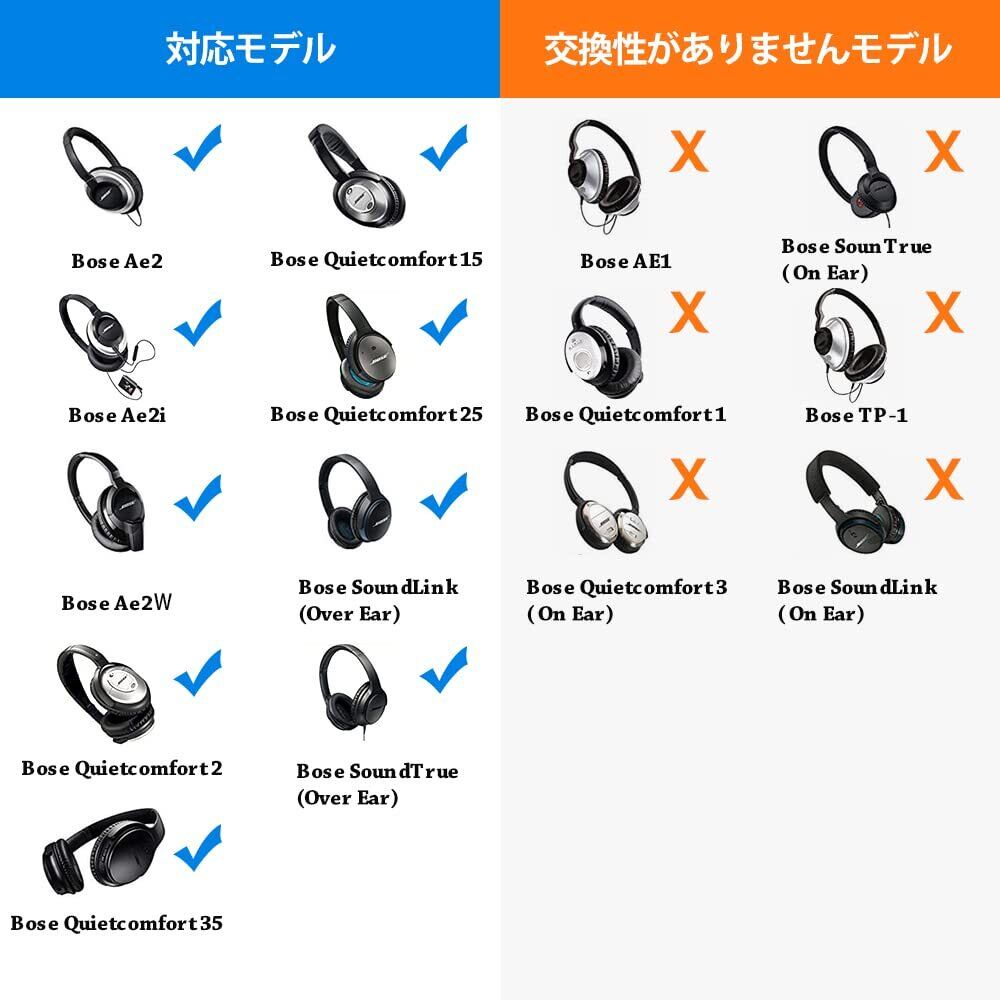【bose ヘッドホン 交換パッドの対応機種】:イヤーパッドの構造は組み立てたままの製品と完全に同じく、Bose Quiet Comfort 35 35II, Quiet Comfort 25, Quiet Comfort 15, Quiet Comfort 2, AE2, AE2i, AE2w, Sound True, Sound Linkヘッドセットに適します。
