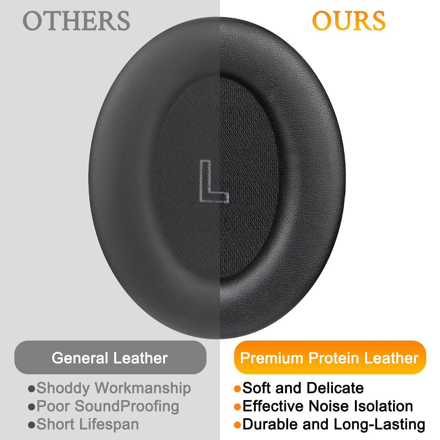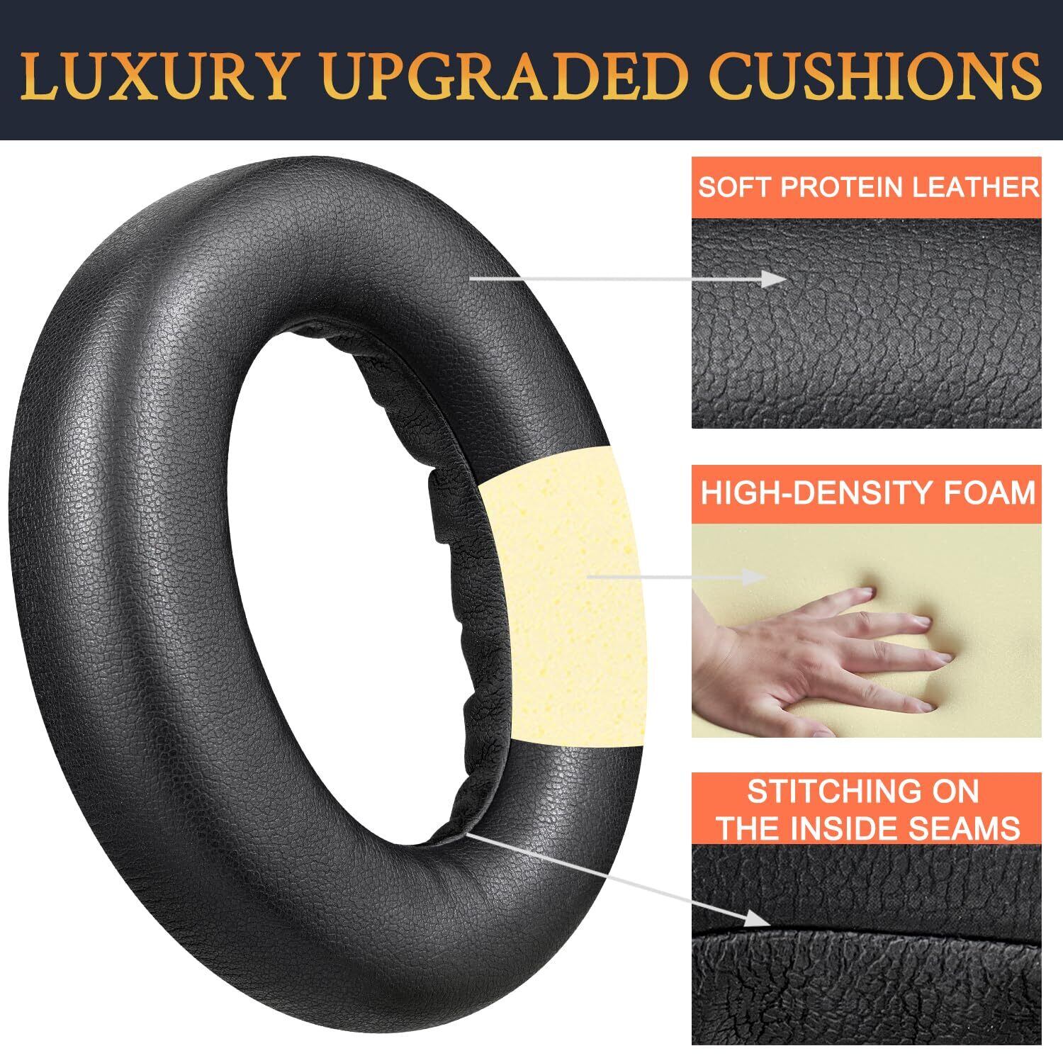 耐久性向上のデザイン:上等なノイズアイソレーションフォームとプレミアムなプロテインレザーを採用して作ってきたイヤーパッドはフィット感がとても良くて、パッドが柔らかくて耳触りもいいです。また追加のステッチが施されており、耳につけると密閉感があり、気密性が高いです。外部ノイズを効果的にブロックしながら快適なフィット感を確保します。
