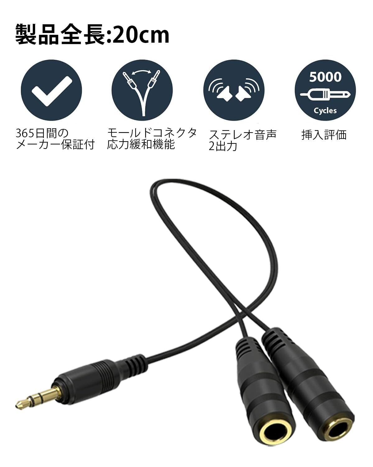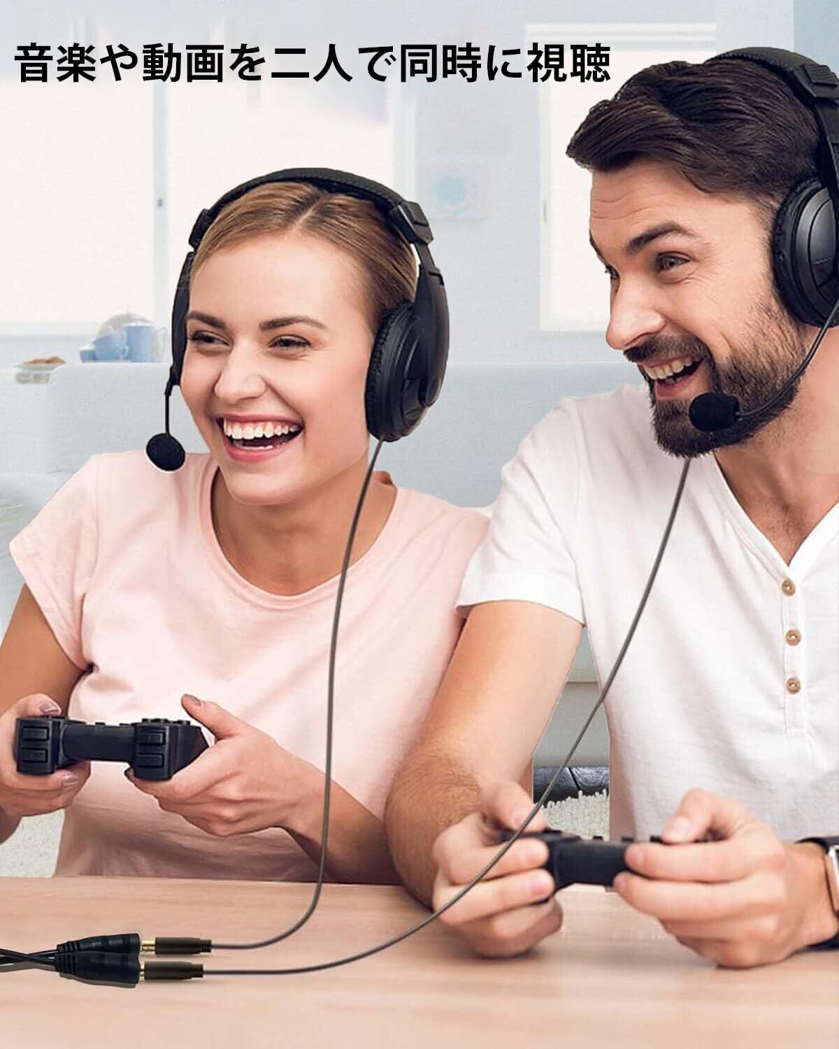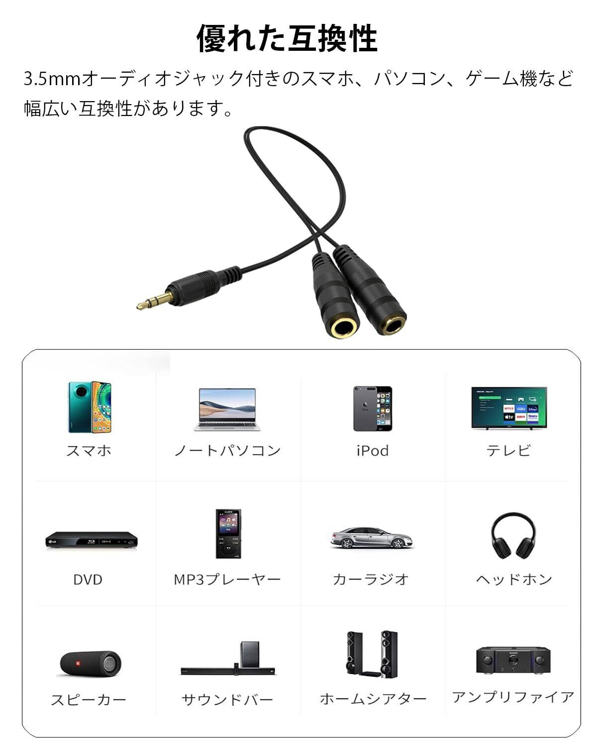 【イヤホン分岐コード】二人でも音楽シャア可能、AUX接続用やイヤホン/スピーカーの2分配出力できるオーディオ分配ケーブルです。3.5mmジャック搭載の設備と接続して、何処でも友達と一緒に高音質の音楽やラジオなどを心行くまで楽しむことができます。**【本製品は3極/4極のヘッドホンに対応しています。4極ヘッドホンを接続した場合、マイクをサポートしていません。】