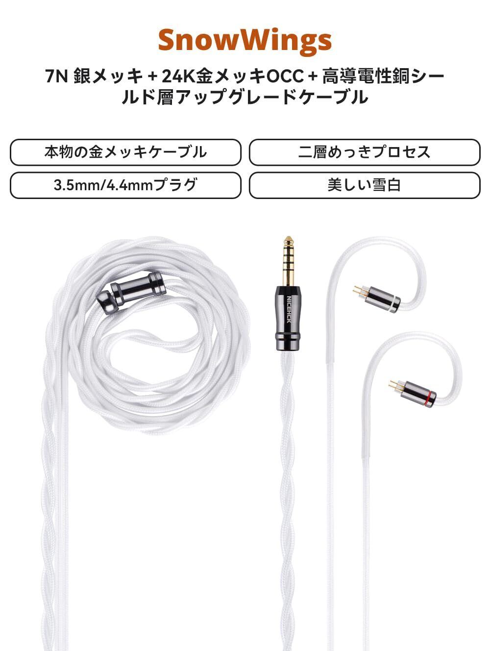 ■【音質を劇的に改善する高品質リケーブル!】NICEHCK SnowWingsリケーブルは、0.78mm 2Pin接続と4.4mmプラグを採用し、7N銀メッキ、24K金メッキOCC、さらに高導電性銅シールド層導体を組み合わせた贅沢な設計です。この構成により、音質が格段に向上し、透明感のあるサウンドを提供します。