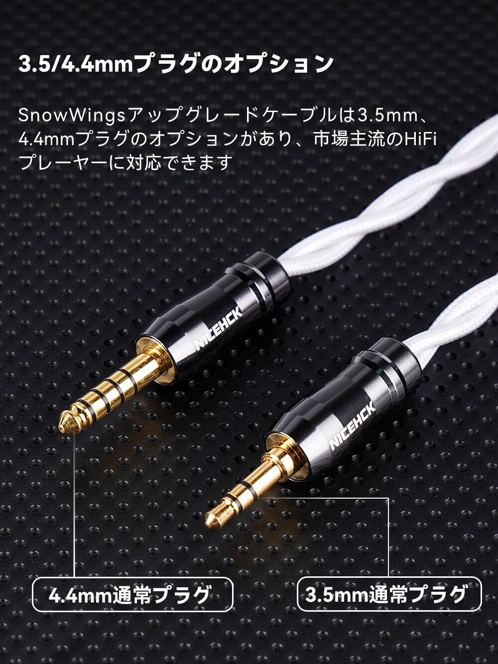 【ボーカル、高音域がきれい】SnowWingsアップグレードケーブルは音質の特徴としては、解像度が高くクッキリ澄み渡ったサウンド、ボーカルの密度が良く、クリアで鋭く、透き通る、ラインの感覚がします、超高音域は伸びが優れています