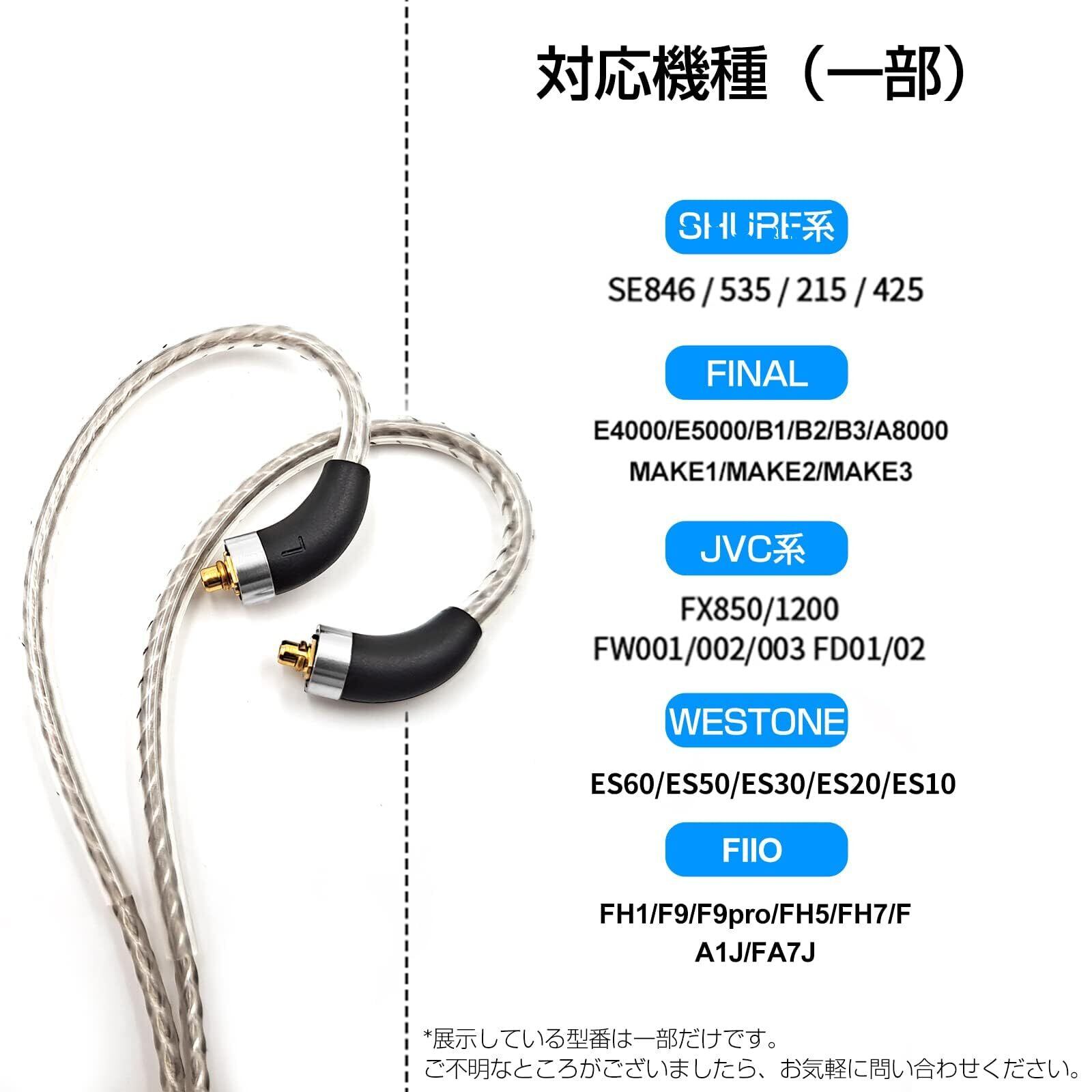 「 対応機種(一部)」SHU--RE系:SE215/SE425/SE535/SE846/SE315等。final系:E4000/E5000/B1/B2/B3/A8000/MAKE1/MAKE2/MAKE3等。JVC系:FX80/1200/FW001/002/003/FD01/02等。WESTONE系:ES60/ES50/ES30/ES20/ES10等。Byerdanamic:XELENTO等。fiio:FH1/F9/F9pro/FH5/FH7/FA1J/FA7J等。以上のイヤホンと互換性があります。また他型番ご不明なところがございましたら、お気軽に問い合わせください。
