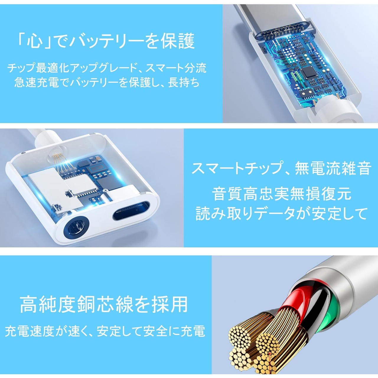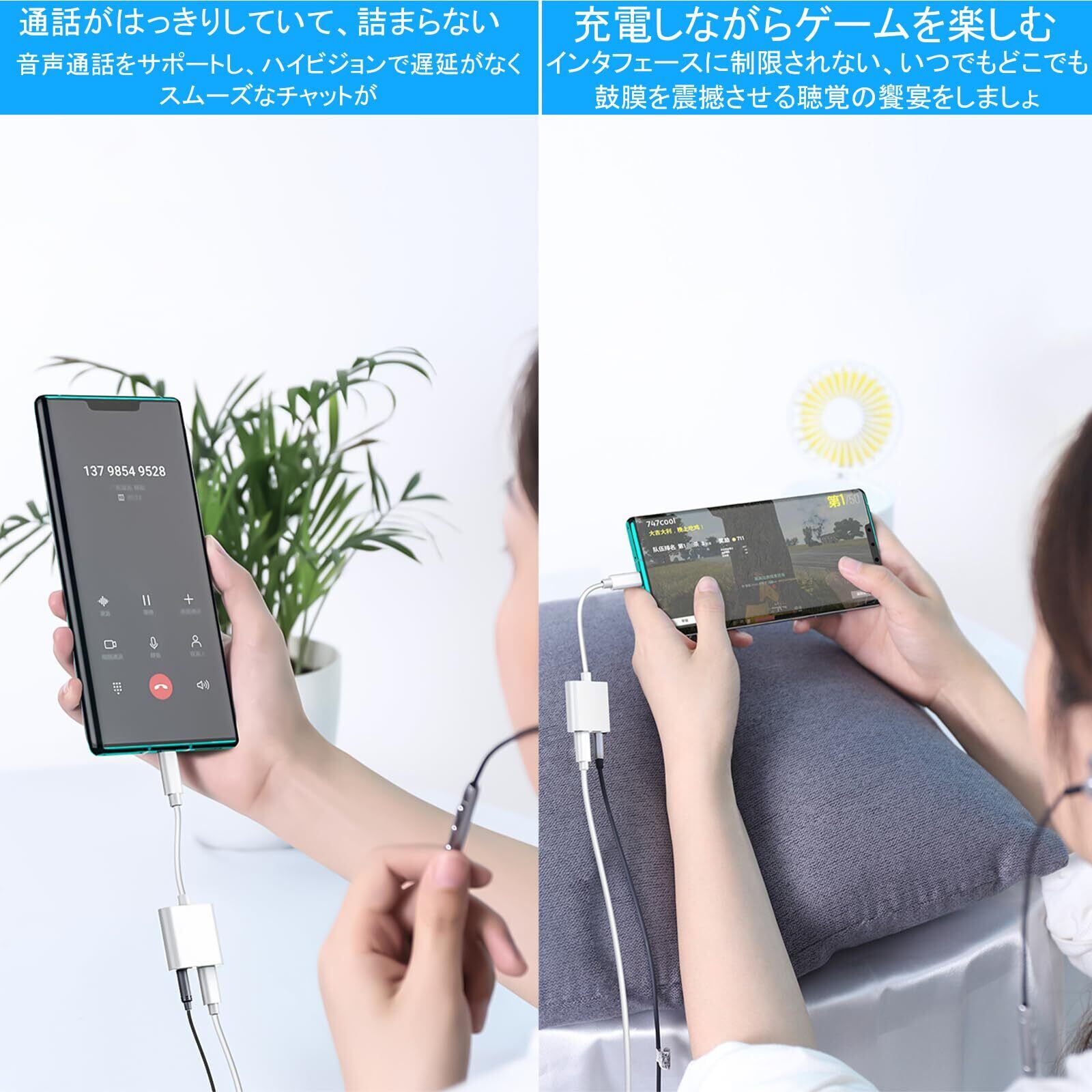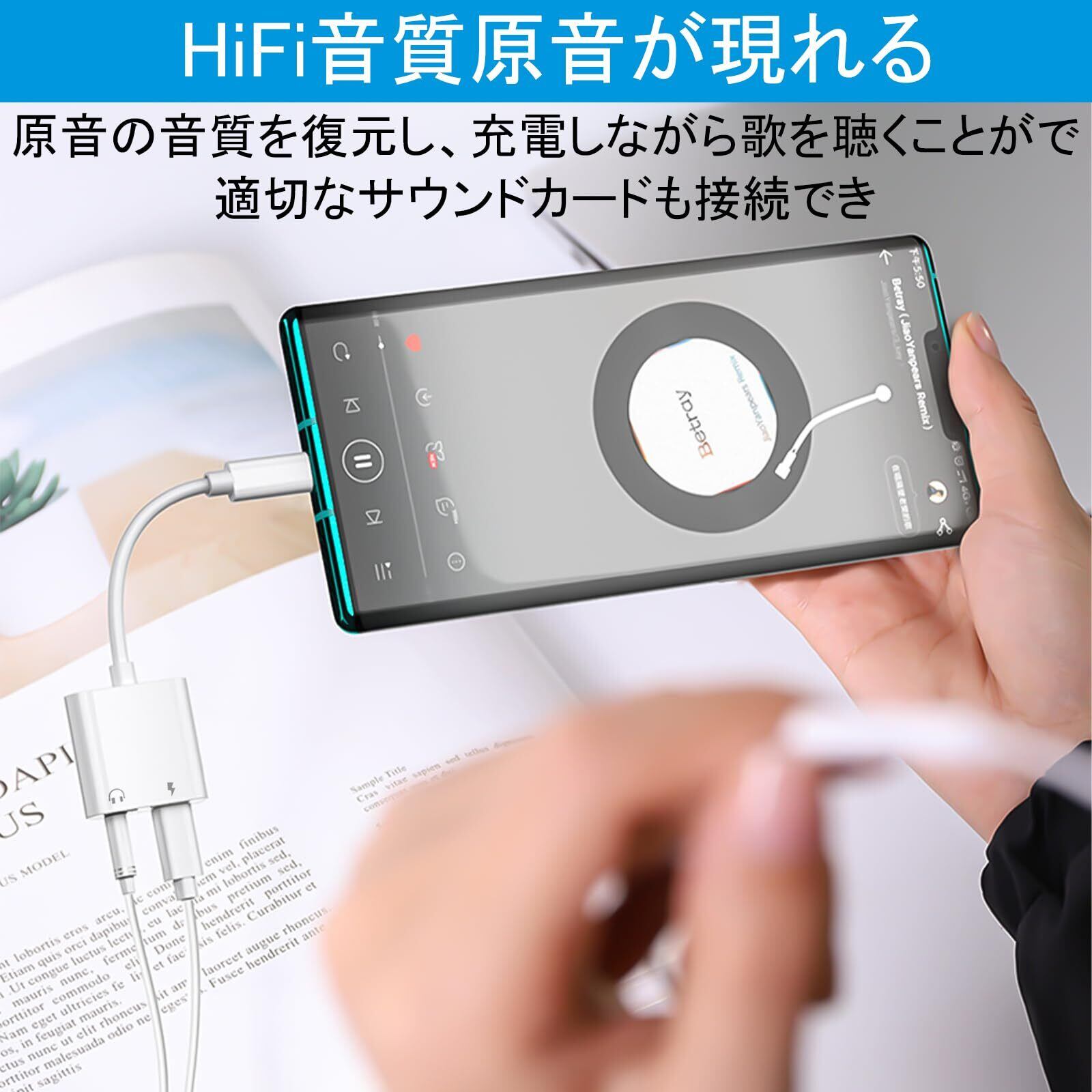 【高音質】100%銅コアは高速で安定した信号伝送とロスレスデジタルサウンドクオリティをご提供します。デジタル-アナログ変換器により高音質を実現します。2in1イヤホン変換アダプタを使用すると、3.5mmジャックのイヤホンで音楽を聴き。音楽の細部と豊かな動態は全て現れます。Hifiモードはほとんど損なわずに音楽を伝達し、音楽のすばらしさを十分に楽しむことができます。