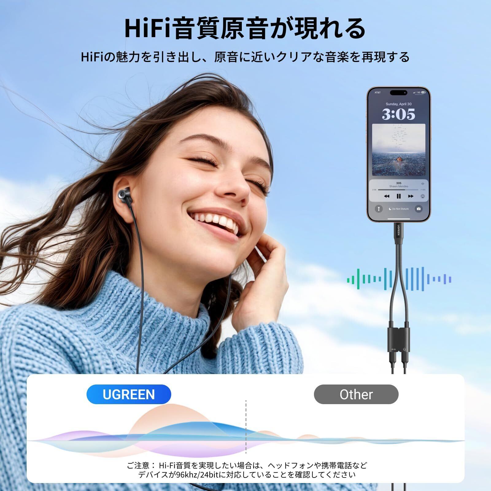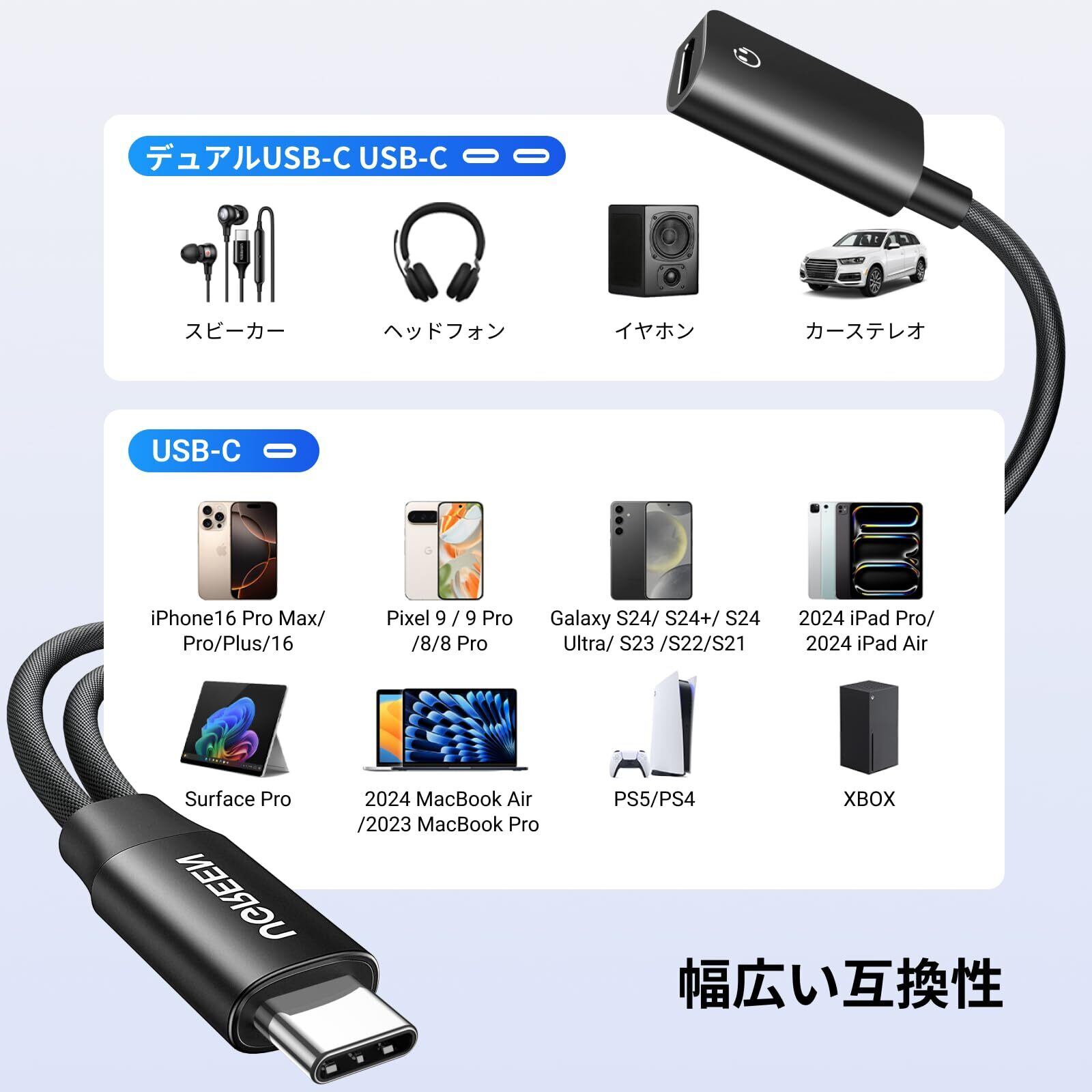 2 in 1タイプC イヤホン変換 アダプタ : UGREEN USB C-Type C 多機能タイプC変換アダプターを使用すると、Hi-Resオーディオと PD 60W の高速充電が可能になり、デバイスを急速充電しながら、音楽を聴いたり、通話したり、ゲームをしたり、ビデオを視聴したりできます。携帯電話のバッテリー切れを心配することなく、美しいオーディオの世界に完全に浸ることができます。 ご注意:充電ポートはデータ転送をサポートされていません。