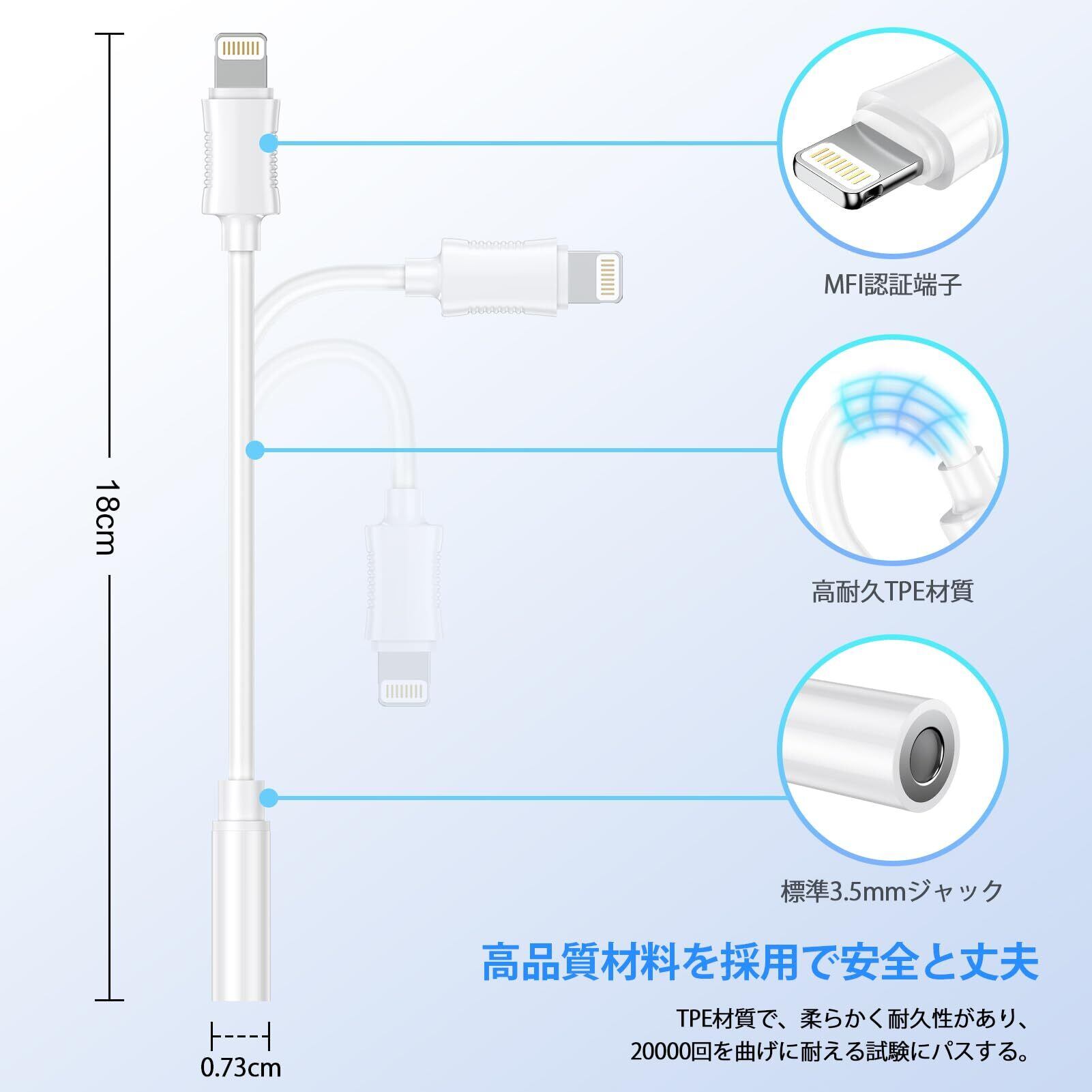 【接続簡単&コンパクト】本ライトニング イヤホンアダプタはiPhoneスマホに接続するだけで、プラグ&プレイして、面倒な設定は必要なく、操作簡単です。【携帯便利】:手のひらにすっぽり収まるサイズ、重さ約10g、長さ約18cm、さっとポケットに入れられて収納・持ち運びに便利です。