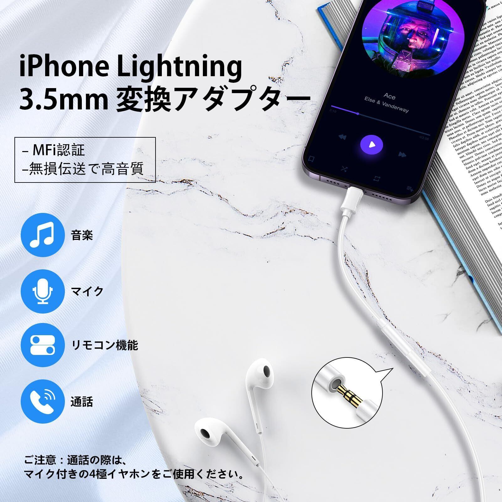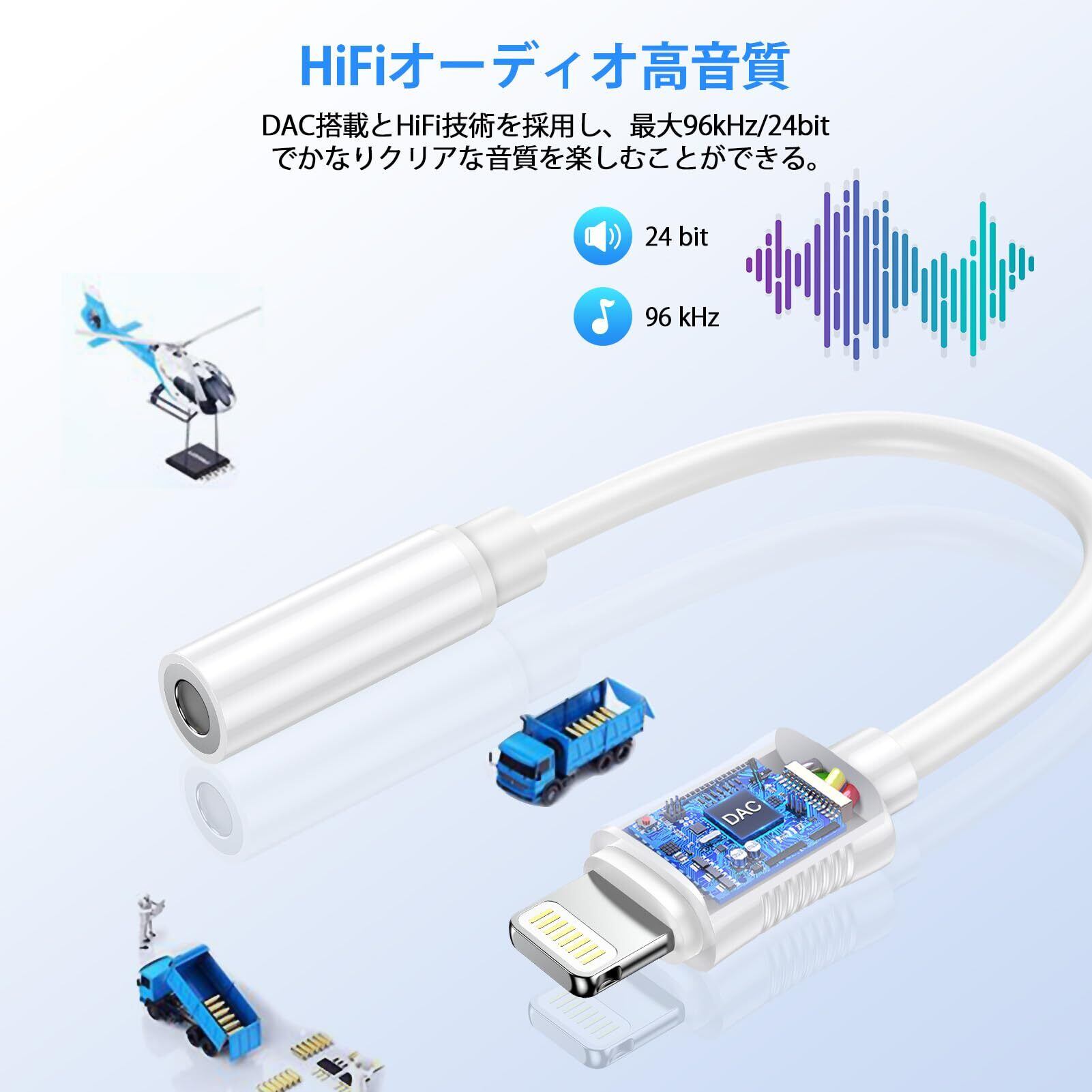 +【HiFi高音質・多機能】このiPhone イヤホンジャック変換アダプターには音声の損失を抑える高品質音声DACチップを採用。最大24bit /96KHzオーディオ出力を提供し、お使いのLightning機器から幅広いヘッドホンやイヤホンから、クリアで繊細なサウンドをお楽しみいただけます。CD音源のような音質を楽しめます。 本製品はリモコン付きイヤホンに対応しており、音量調節や音楽の再生・一時停止などを、iPhoneを取り出さずに行えます。マイクが付いているイヤホンを使用すれば、通話も可能。(*ご注意:雑音などの接触不良がある場合は、イヤホンを再挿入してお試しください。)