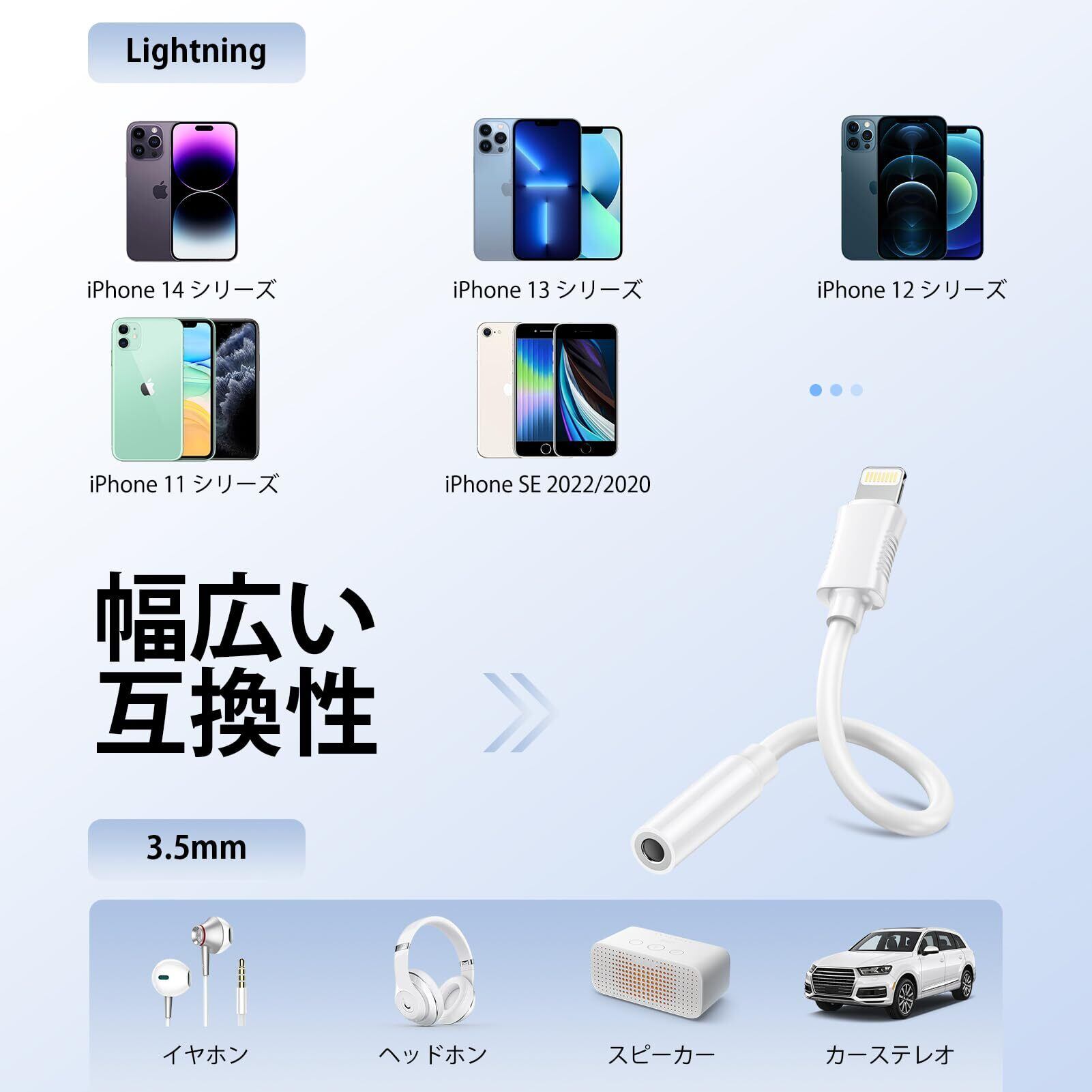 【MFi認証&幅広い互換性】のLightning イヤホン変換アダプタはMFi認証が取得済みです。認証されたICチップを搭載して、3.5mm-ライトニング イヤホン変換アダプタはiPhone・iPadなど、iOSアップデート後も引き続き使えることをできます。iPhone 14/14 Plus/14 pro/14 Pro Max/13/13 Pro/12/12 Pro/SE/11/11 Pro/XS/XS Max/XR/X/8 7 6 Plus、iPod touchs第6世代、iPad Mini/iPad Air/iPad Proなど機種に全対応します。(※USB-Cポート付きのiPad Proには対応していません。)スピーカー、タブレット、カーステレオ、ヘッドフォン、Hi-Fiなど、通常の3.5mm補助アダプタケーブルのオーディオ挿入部を持つすべてのデバイスをサポートしています。