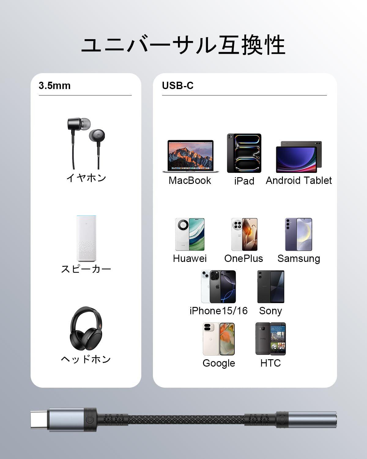 [幅広い互換性] このtypec イヤホン変換アダプタは、ほとんどのType-Cインターフェースを搭載したスマートフォンと互換性があります。このiPhone イヤホン 変換アダプタはiPhone 16/16E/16 Plus/16 Pro Max、iPhone 15/15 Plus/15 Proに対応しています。このイヤホン 変換 タイプcアダプターは、サムスン・ギャラクシーS25/24 Ultra/S23+/S23/S22/S22+/S22 Ultra/S21/S21+/S21 Ultra/S20+/S20 Ultra/S10e/S10/Note 20/20+/20/10/10+/9/8,Z Fold 2/3,Z Flip 3に対応しています。このイヤホンジャック タイプcアダプターは、Huawei Mate 60/50/40/30/20/P60/P50/P40/P30/P20、Pixel 8/7/6/5/4/3/2/XL、Xiaomi 14/13/12/11/10/9、iPad Pro、MacBook、HTC U12/Ultra、Moto Z/Z2 シリーズにも対応しています。