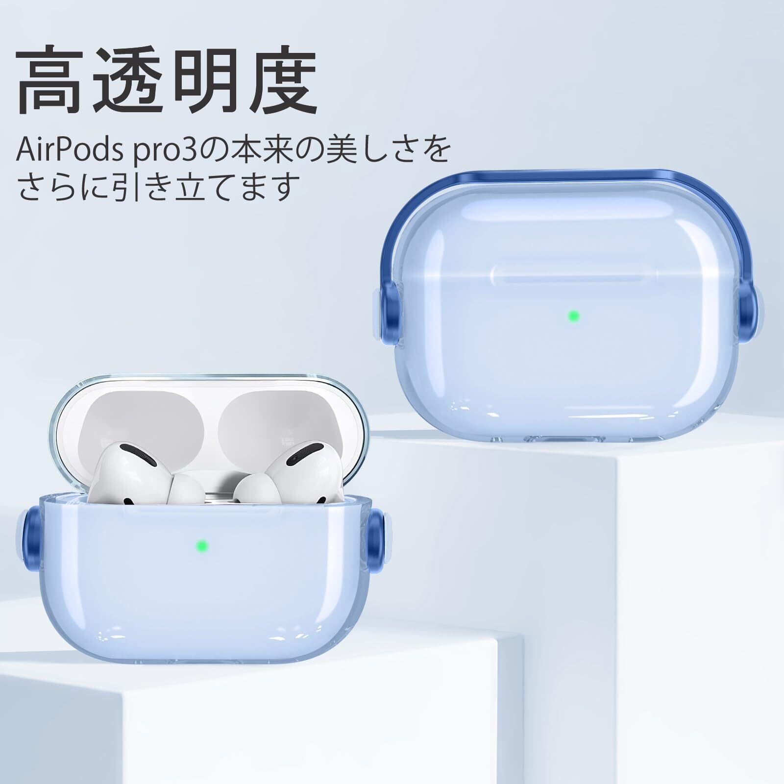 HEIGKOIK AirPods Pro 第3世代 ケース 2025年発売 エアポッズプロ3 カバー TPU クリア 透明 黄変防止 ロック付き LEDインジケーター可視 耐衝撃 落下防止 カラビナ付き 携帯便利 スタンド機能 ワイヤレス充電対応 おしゃれ かわいい 軽量 薄型 (クリアブルー, AirPods Pro3)