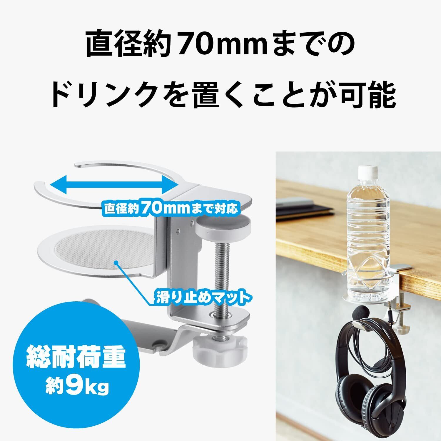■ヘッドホンとドリンクをまとめて収納できる、ドリンクホルダー付きのヘッドホンスタンドです。 ■ヘッドホンのハンガー部は360度回転可能でデスク下に収納できるので、使用したいときだけデスク下からヘッドホンを取り出すことができます。 ■クランプ式で、デスク下にしっかり取り付けられます。 ■天板厚み約50mmまでのデスクに対応します。 ■直径約70mmまでのドリンクを置くことができます。 ■ハンガー部にはプラグやコードを引っ掛けることができるフックが付いています。