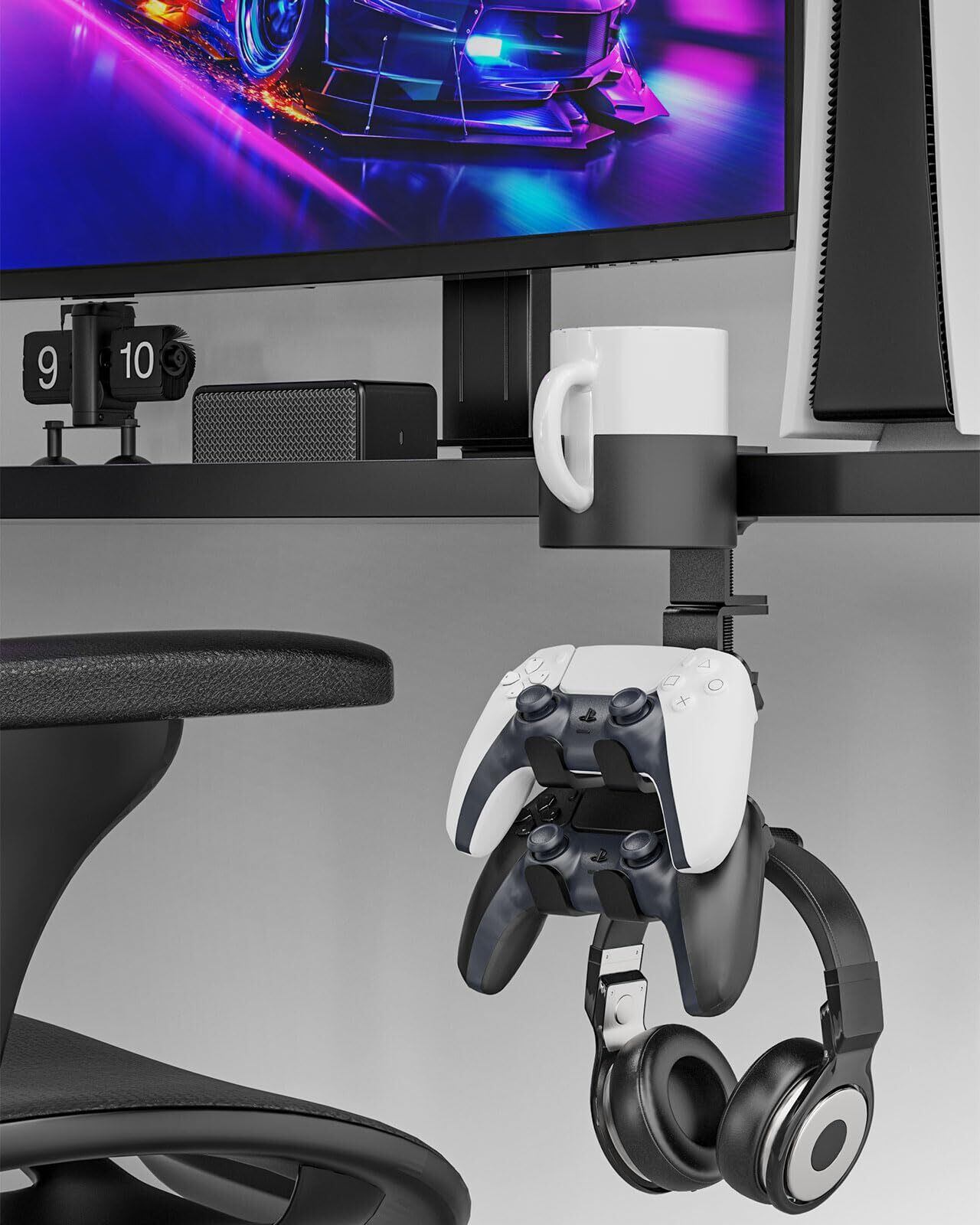 「3in1マルチ収納ホルダー」デスクの天板や棚などに引っ掛けて使用する仕組みになる置きっぱなしにしがちなヘッドホンとコントローラーを同時に収納させるホルダーとなります。デスクのスペースを圧迫せず、場所をとらずにすっきりヘッドホンを掛けておくことができます。基本的なヘッドホンやコントローラー収納用にとどまらず、雑多になりがちなバッグや軽量な傘でも掛けることに対応しております。最大2つのコントローラーと1つのヘッドホンと1つのカップを同時に収納対応できます。