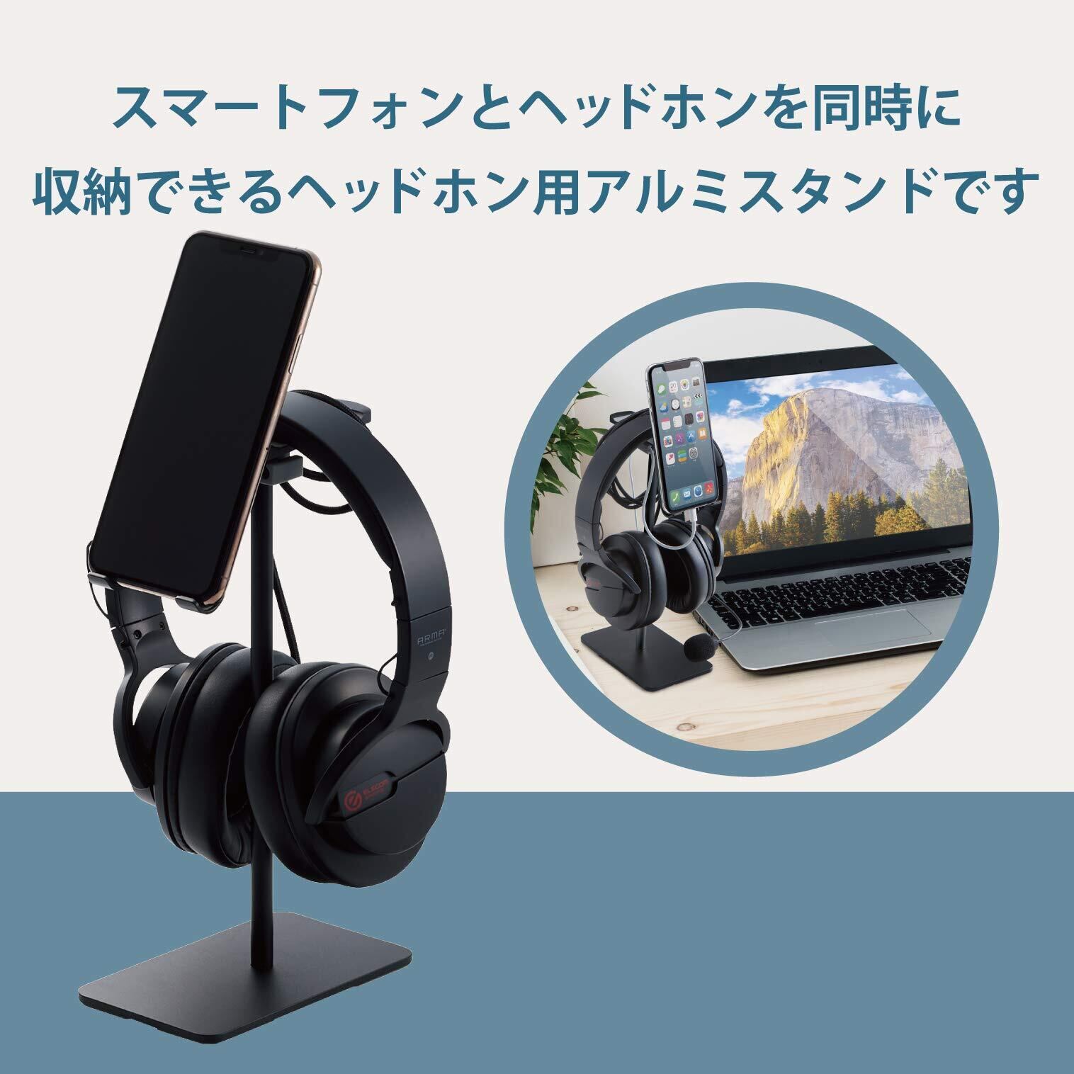 ■ スマートフォンとヘッドホンを同時に設置・収納できるスマートフォン対応のヘッドホン用アルミスタンドです。