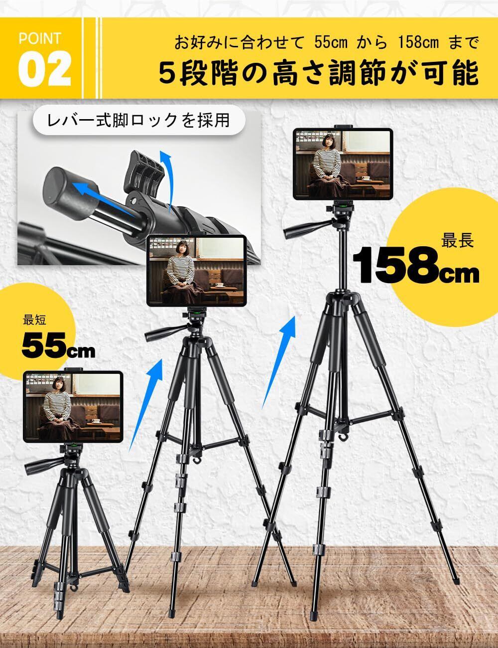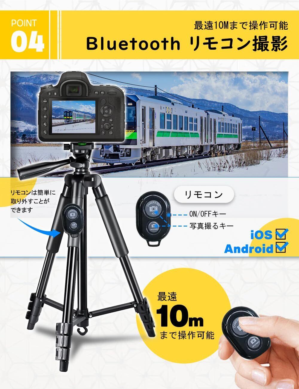 カメラ三脚 三脚 ビデオカメラ三脚 最大長158センチ 3WAY雲台 5段階伸縮Bluetoothリモコン付き三脚 スマートフォン スマホ 三脚 軽量 ミニ三脚 収納袋付き 水準器付き 持ち運び便利 iPad/Android/カメラ/一眼レフなど対応 自撮りや写真と生ライブ配信なども適用 日本語取扱書付き