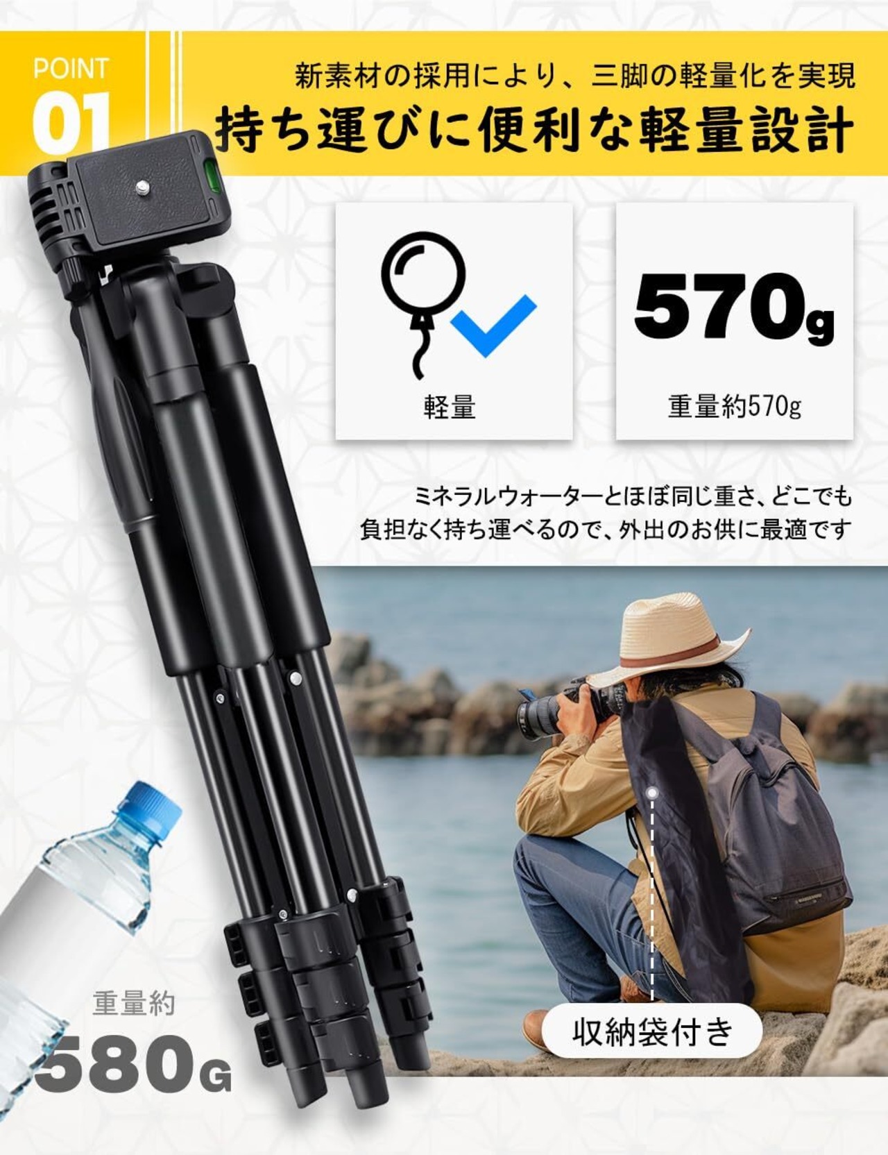 【軽量化デザイン&アルミ全身】:新型スマホ用の三脚は軽量化を開発完了しました!全身優秀なアルミ材を採用し、操作しやすい雲台も含めて、大人の身長以上の高さと抜群の安定感を持つ三脚と登場しました!本体部が大きくしっかりしている三脚はぶれに強くて、主な素材がプラスチックより金属ですので、強度に大きな差が出ます。三脚全身の重さは570グラムのみで一本の水(500ML)よりもっと軽い。もちろん、24ヶ月サービス延長します !是非ご安心ください。