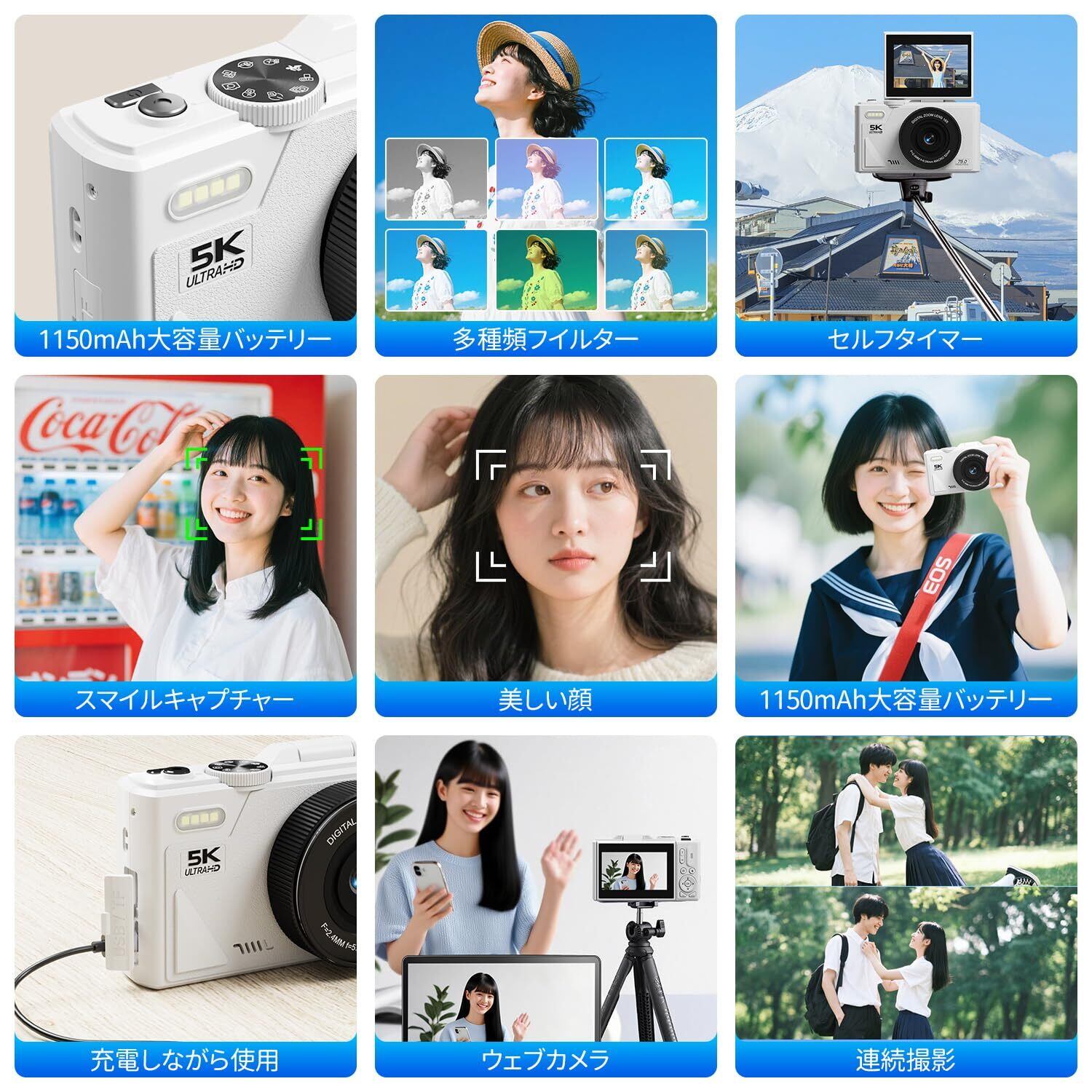 【三つのフォーカスモード&機能豊富】ピントを自動的にあわせるオートフォーカス機能、半押しで手動的にピントをあわせるマニュアルフォーカスと固定フォーカスと三つのフォーカスモードが搭載されており、ニーズによりお選びいただきますので、ぼやけることなく美しく鮮明な写真を簡単に撮影することができます。また、ビューティーフィルター、セルフタイマー、連写、スロモーションなど多彩な機能を搭載しており、初心者の方でも撮影を楽しめる4Kカメラです。高画質ビデオ通話や生放送を行うなどウェブカメラとしてもお使いいただけます。LEDライトも付属しているので、夜間や暗い部屋での撮影も簡単に行うことができます。