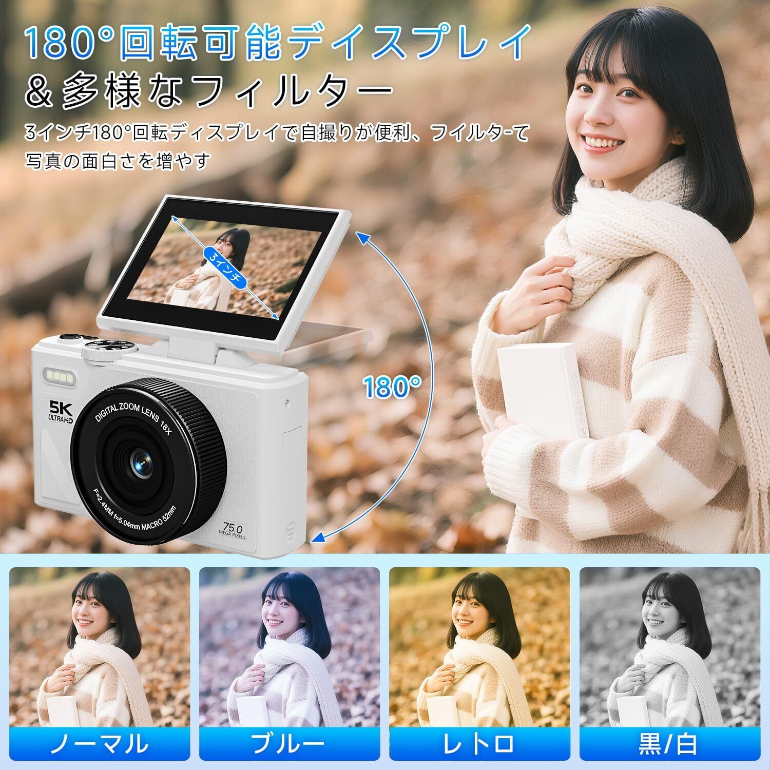 【2025最新】SRAR デジタルカメラ 5K 録画 デジタルカメラ 7500 万画素 Wi-Fi 機能 180 度回転ディスプレイ 自動 18 倍デジタルズーム 連続撮影 自撮り 3.0 インチスクリーン 32GB マイクロ SD カードをプレゼントします 1200mAh バッテリー 軽量 持ち運び便利 ポケットカメラ 学生 初心者 修学旅行 Vlog 小型 コンパクトカメラ (ホワイト)