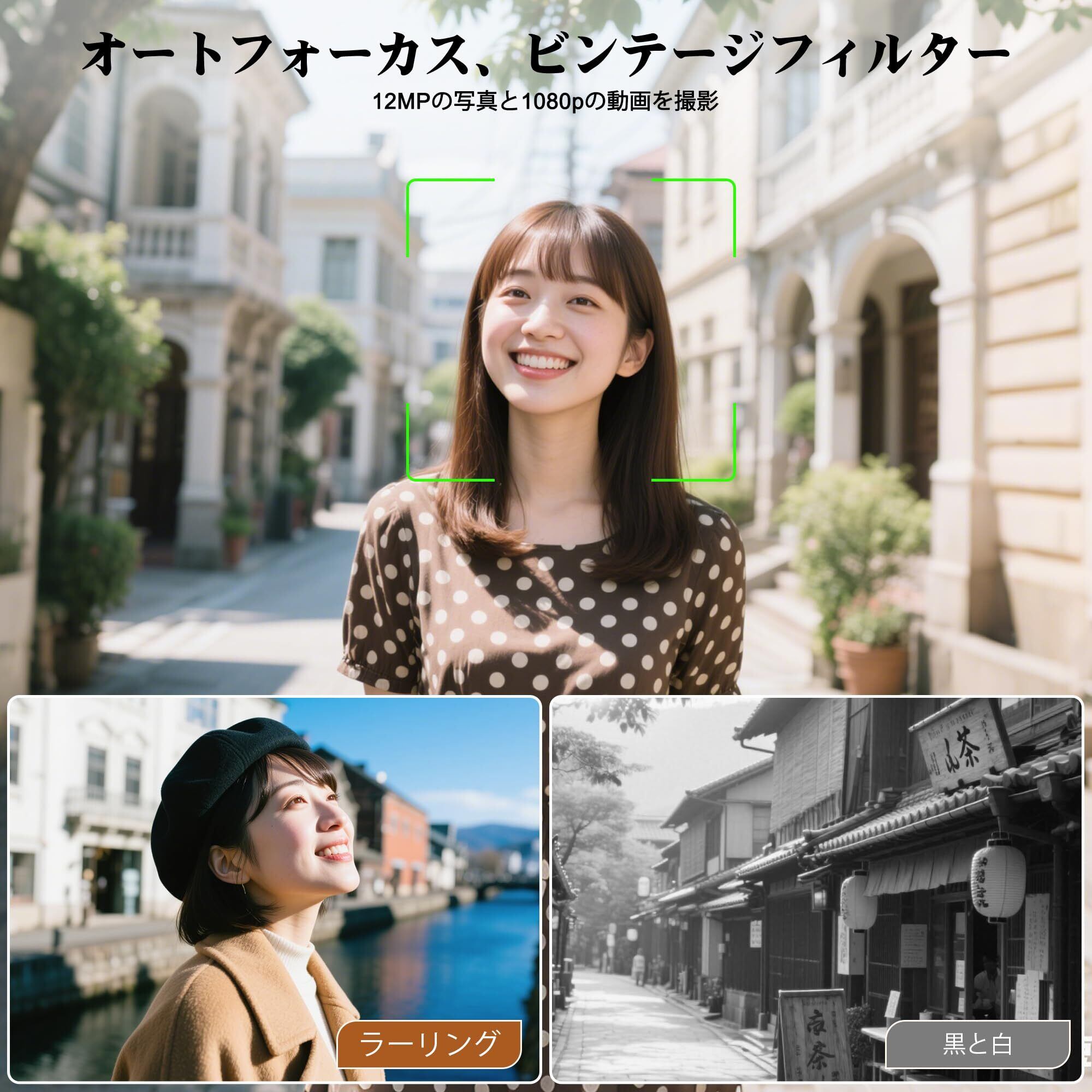 ヴィンテージ・ミニ・デジタルカメラ:カメラは、クラシックなヴィンテージスタイルと機能性を融合させたカメラです。12メガピクセルのヴィンテージ写真と1080PフルHDビデオを撮影できます。1.54インチのユニークなビューファインダーとクラシックなジョイスティックがヴィンテージの魅力を演出します。街中を歩いているときでも、パーティー会場でも、このカメラはクールでユニークなアクセサリーとして、大切な思い出を撮影する準備ができています